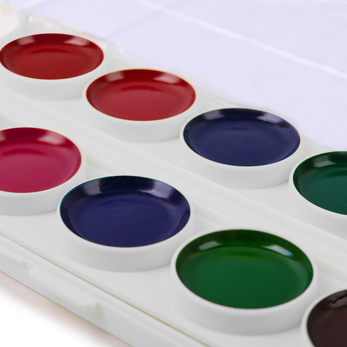 Акварель выпускается в двухъярусном пластиковом пенале с прозрачной крышкой. Двухъярусная форма пенала делает его компактным по размеру, благодаря чему можно сэкономить место в рюкзаке. Удобный замок легко открывается и закрывается. Пенал достаточно прочный, выдерживает многократные падения. Крышку можно использовать как палитру для смешивания красок, есть отделение для кисточки .
