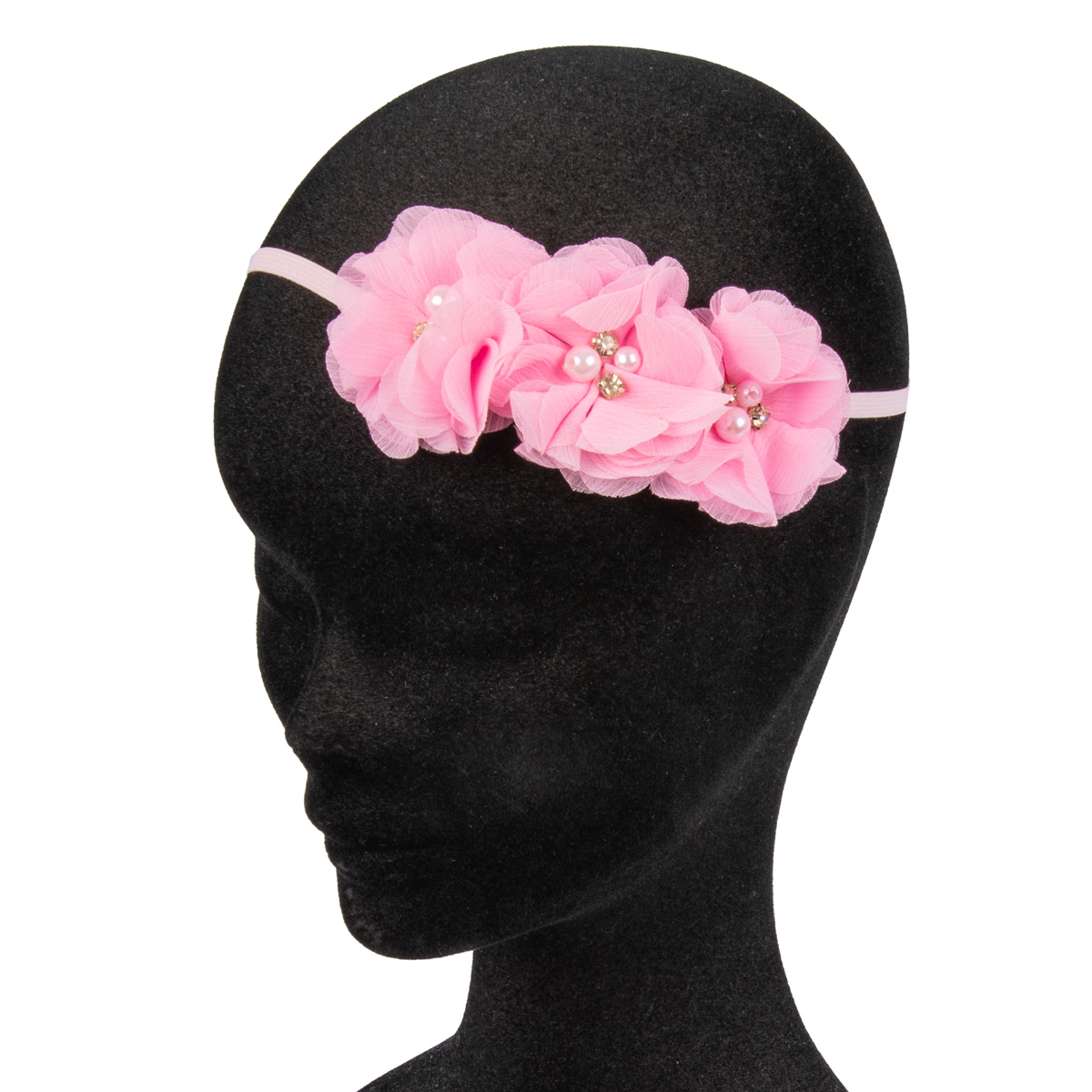 Нежная повязка на голову с объемным текстильным цветком, жемчужными бусинами и стразами.
