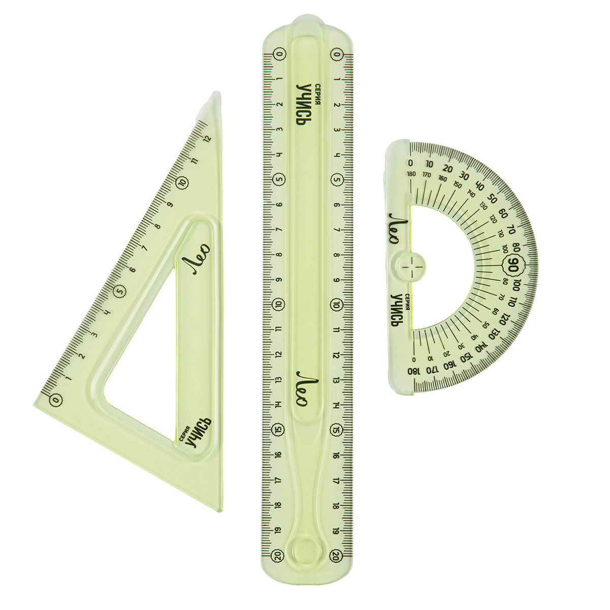 Лео LSRFS-20 Набор гибких линеек 3 предмета (линейка 20 см, угольник 30/60 гр.14 см, транспортир 11 см) в пакете с еврослотом 03 зеленый Фото 2.