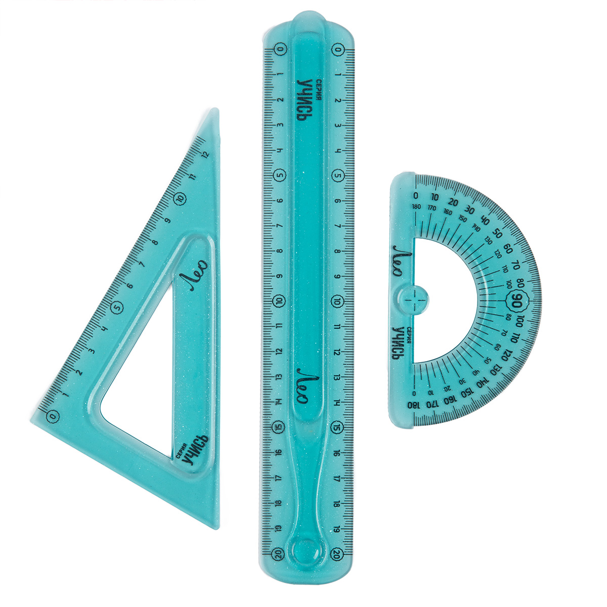 Лео LSRFSG-20 Набор гибких линеек 3 предмета (линейка 20 см, угольник 30/60 гр.14 см, транспортир 11 см) с глиттером в пакете с еврослотом 04 бирюзовый с глиттером Фото 2.