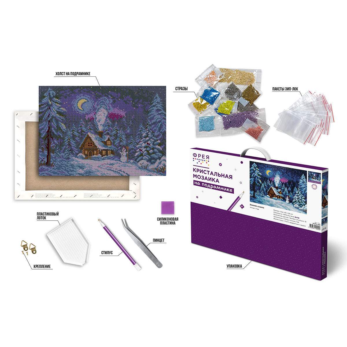 Крепление, Лоток, Пинцет, Стилус, Стразы, Холст с клеевым слоем и защитной пленкой на подрамнике