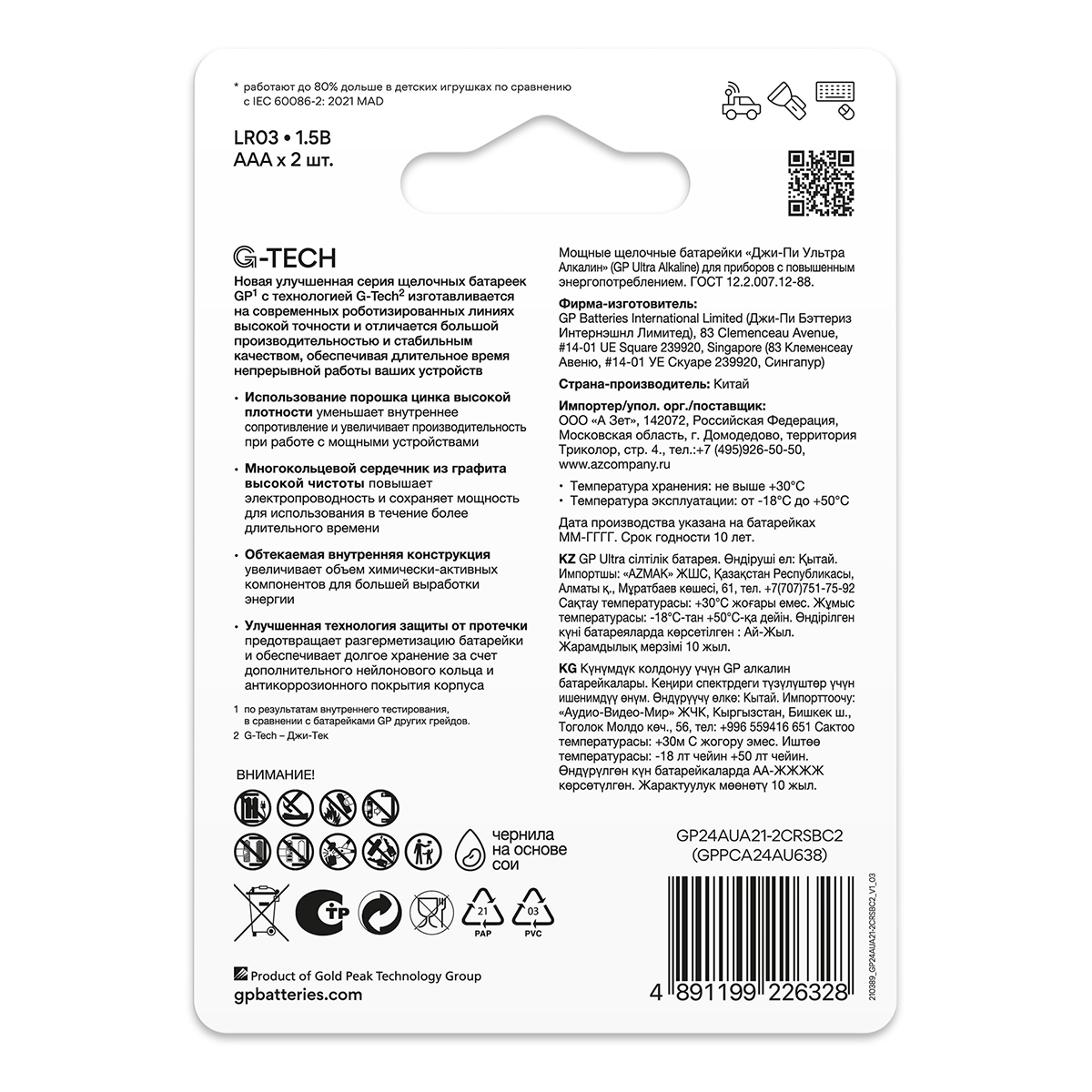 GP Алкалиновые батарейки GP Ultra Alkaline G-Tech 24A AАA 2 шт в блистере GP 24AUA21-2CRSBC2 20/160 Фото 8.