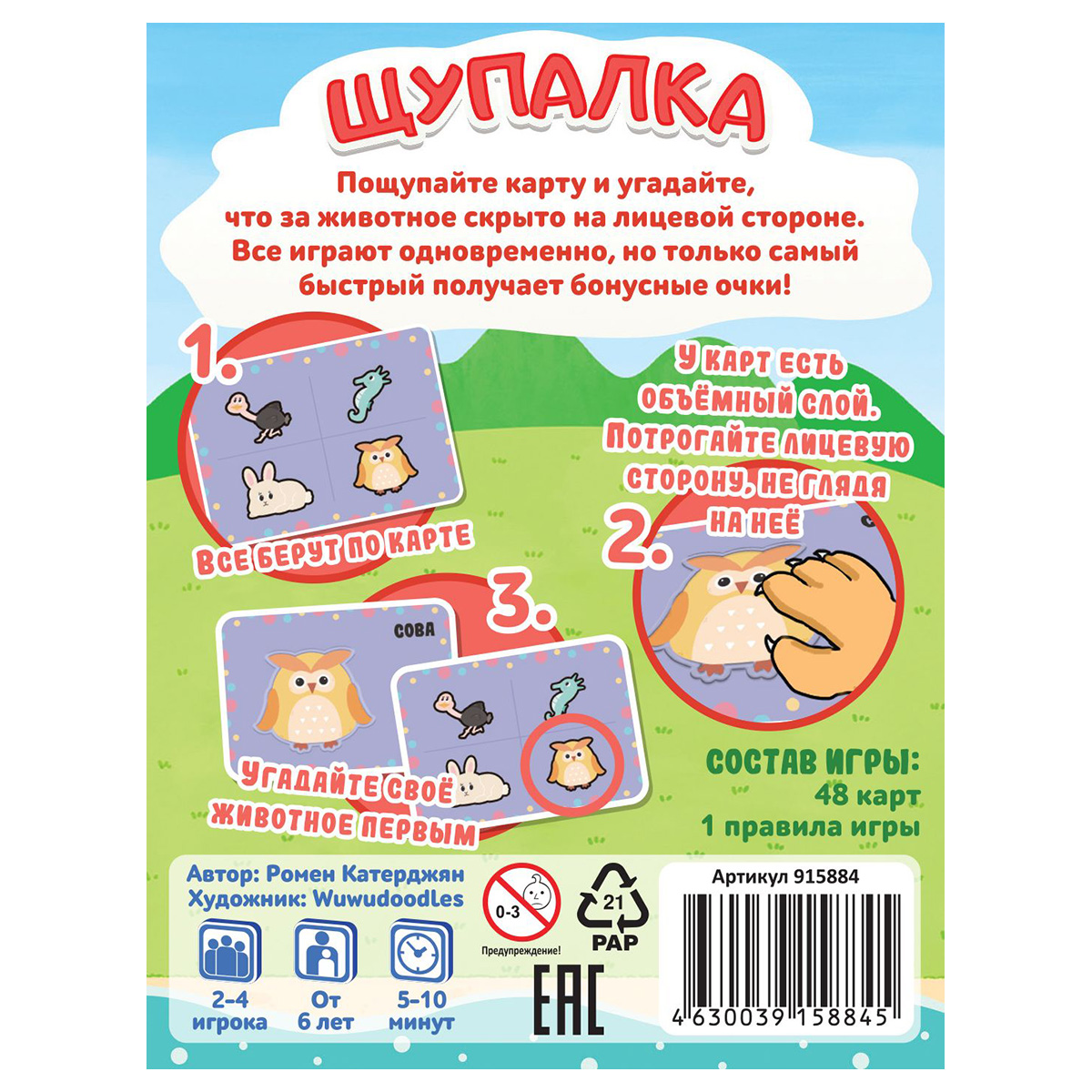 Пощупайте карту и угадайте, что за животное скрыто на лицевой стороне. Все играют одновременно, но только самый быстрый получает бонусные очки! Все берут по карте У карт есть объёмный слой. Потрогайте лицевую сторону, не глядя на неё Угадайте своё животное первым