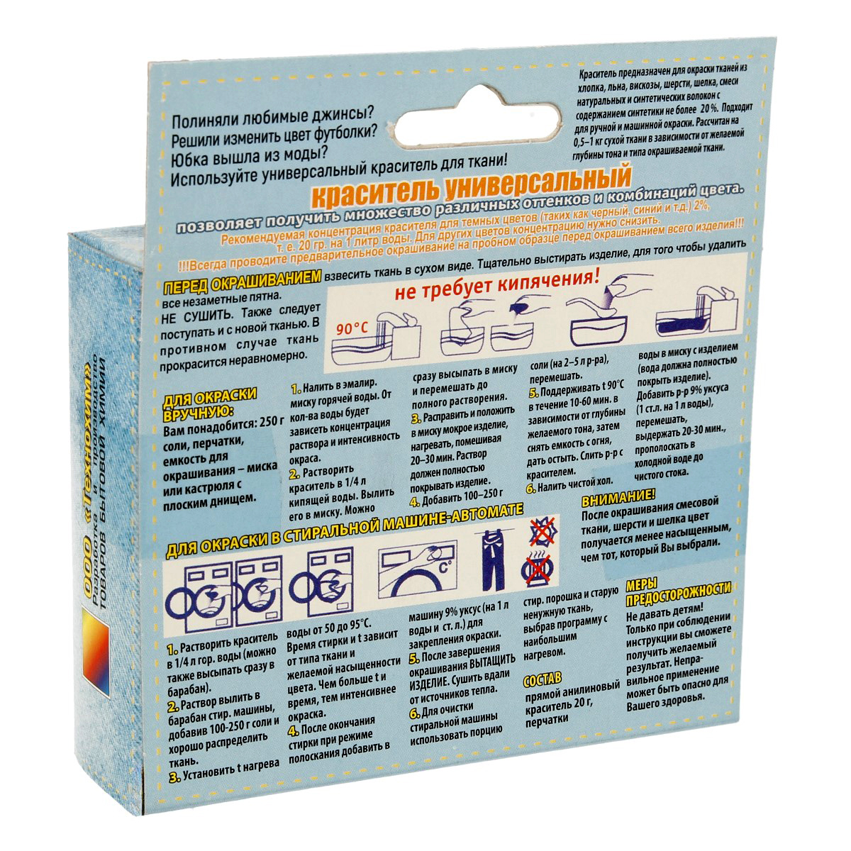 Предназначен для окраски тканей из хлопка, льна, шерсти, шелка, смеси натуральных и синтетических волокон, где синтетики не более 20%. Рассчитан на 1 кг сухой ткани в зависимости от желаемой глубины тона и типа окрашиваемой ткани. Желаемый результат можно получить только при соблюдении инструкции на упаковке.