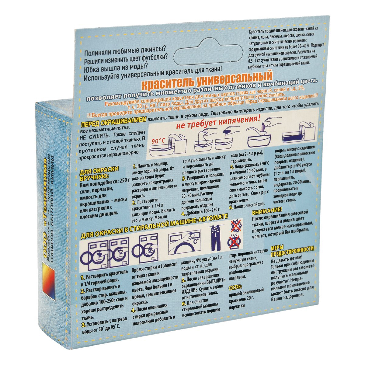 Предназначен для окраски тканей из хлопка, льна, шерсти, шелка, смеси натуральных и синтетических волокон, где синтетики не более 20%. Рассчитан на 1 кг сухой ткани в зависимости от желаемой глубины тона и типа окрашиваемой ткани. Желаемый результат можно получить только при соблюдении инструкции на упаковке.
