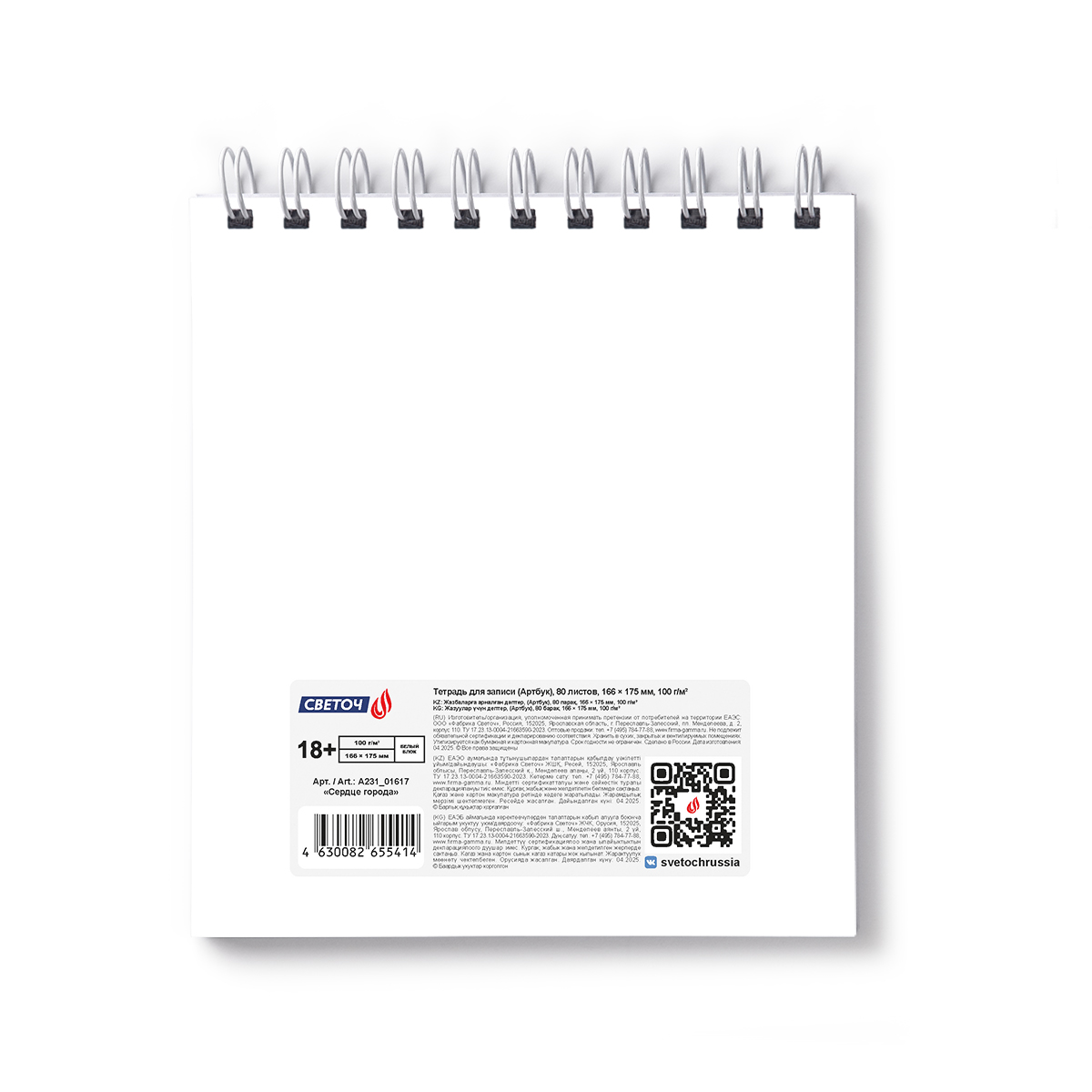 Светоч А231 Артбук (Скетчбук), блок белый, жесткая подложка, 100 г/м2 166*175 мм на гребне 80 л. Сердце города 01617 Фото 1.