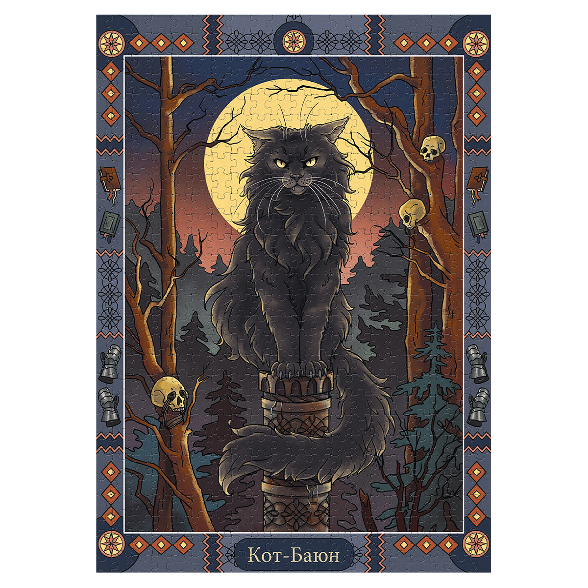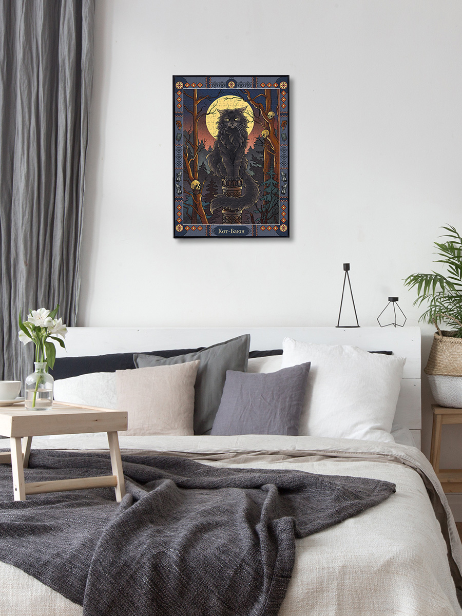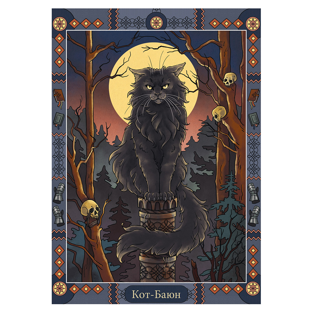 Кот Баюн – огромный черный кот. Он обитает на высоком железном или золотом столбе в безжизненном лесу. Когда идет вниз по столбу – песни поет, поднимается вверх – сказки рассказывает. Когти у кота железные, а голос раздается на несколько верст и напускает на врагов неодолимый сон. Имя кота Баюн означает рассказчик, сказитель и происходит от глагола баять – рассказывать, говорить. Если герою сказки удается победить кота, Баюн соглашается служить ему: рассказывать целебные сказки, которые могут спасти от любого недуга. В ранних изданиях русских сказок кот Баюн не встречается, поэтому есть мнение, что это поздний персонаж, придуманный только в XIX веке. Кот ученый из сказки Пушкина «Руслан и Людмила» – интерпретация образа кота Баюна