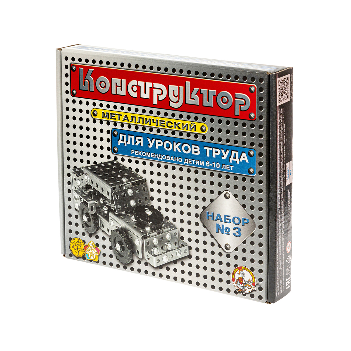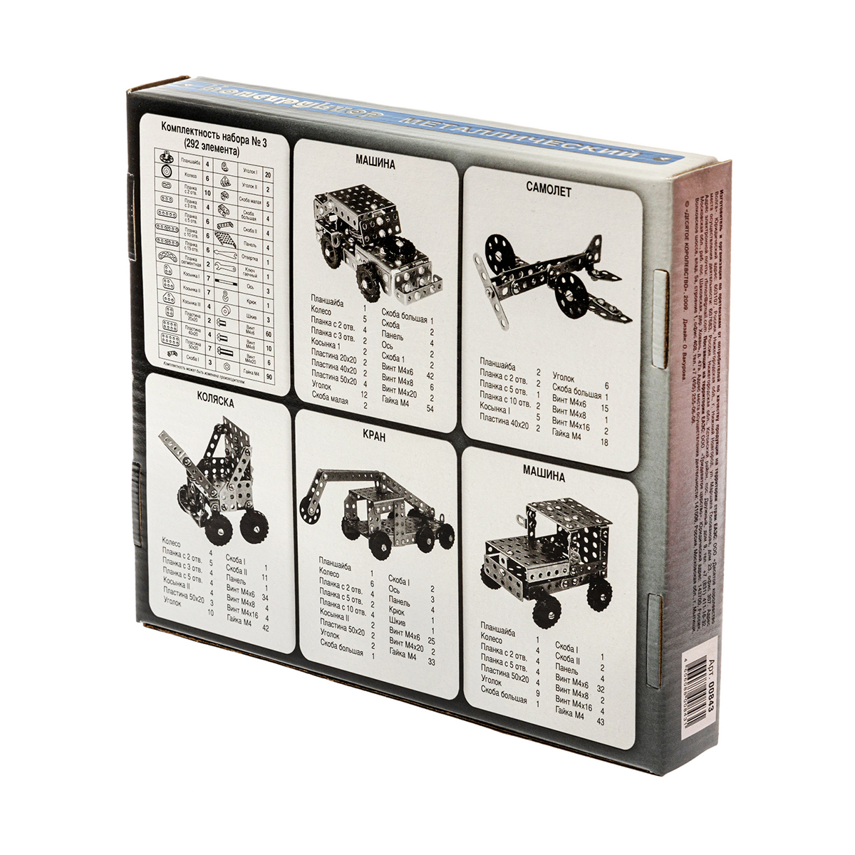 Металлический конструктор №3 для уроков труда. Состав набора: пластина 20 х 20 – 2 шт., пластина 40 х 20 – 4 шт., пластина 50 х 20 – 7 шт.; планка с 2 отверстиями – 10 шт., планка с 3 отверстиями – 4 шт., планка с 5 отверстиями – 6 шт., планка с 10 отверстиями – 6 шт., планка с 15 отверстиями – 6 шт., планка сегментная – 2 шт.; косынка I – 7 шт., косынка II – 7 шт., косынка III – 4 шт.; уголок I – 20 шт., уголок II – 2 шт.; скоба малая – 5 шт., скоба большая – 4 шт., скоба I – 3 шт., скоба II – 4 шт.; панель – 4 шт.; отвёртка – 1 шт.; ключ гаечный – 1 шт.; ось – 3 шт.; винт М 4 х 6 – 60 шт., винт М 4 х 8 – 20 шт., винт М 4 х 20 – 6 шт.; гайка М4 – 90 шт.; планшайба – 4 шт.; колесо – 6 шт.; шкив – 3 шт.; крюк – 1 шт.; инструкция. Всего – 292 элемента. Материалы: металл и пластика. Доступны к сборке 5 моделей: 2 вида автомобиля, самолёт, коляску и кран. Детали имеют размер от 2 до 15 см, толщина металла составляет 0,8 мм. Расстояние между центрами отверстий – 10 мм. Крепёж имеет резьбу М4.