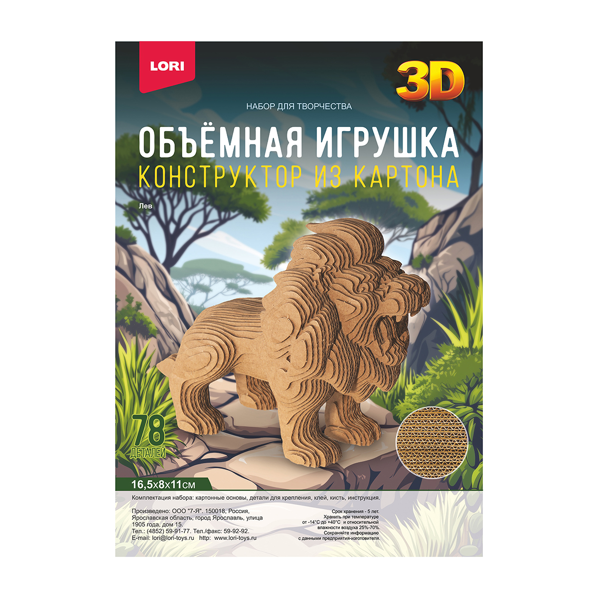 Картонные основы, детали для крепления, инструкция, клей. Представляем вашему вниманию уникальный и забавный 3д конструктор из картона.! Этот набор предназначен тех, кто хочет окунуться в мир творчества, фантазии и веселья. Не упустите возможность подарить себе и своему ребенку незабываемые часы совместного времяпровождения, создавая удивительные и яркие фигурки. Все детали интерьерного конструктора выполнены из плотного и качественного картона, который обеспечивает прочность и долговечность конструкции. Благодаря этому, ваши творения будут радовать глаз на протяжении долгого времени. 3D пазл легко собирается благодаря подробной инструкции, которая идет в комплекте. Картон – это экологически чистый материал, который не наносит вреда окружающей среде и здоровью человека. Сборка картонного конструктора поможет развить у ребенка мелкую моторику, логическое мышление, фантазию и творческие способности. Также 3d конструктор станет отличным способом провести время весело и с пользой для всей семьи. Готовые модели станут прекрасным украшением интерьера. Подари эмоции вместе с российским производителем товаров для творчества Эксклюзивно от LORI!