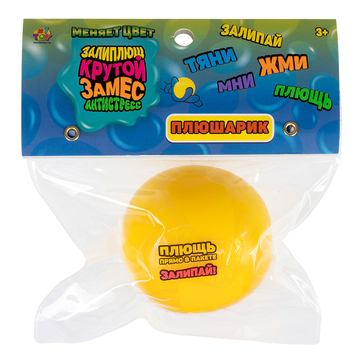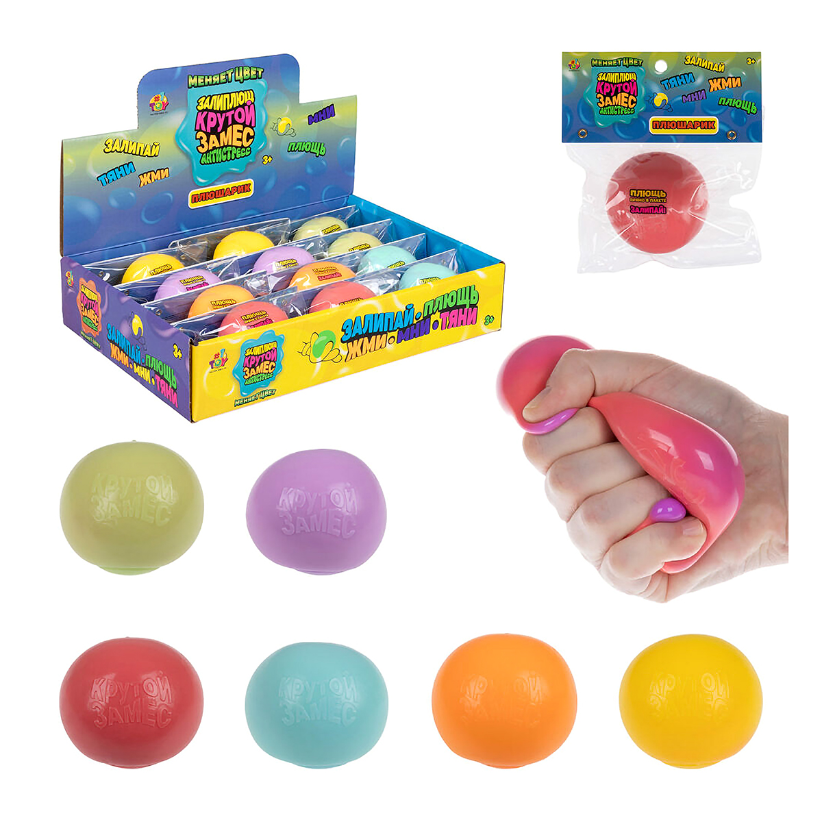 Встречайте! «Залиплющ» Крутой замес от 1TOY! Залипай, плющь, жми, тяни – находи свой способ отдыха! «Плюшарик» – забавный антистресс, который меняет цвет и отлично прилипает к ровным поверхностям и возвращается в исходный вид после любого «плющения». Каждый мячик имеет диаметр около 6 см. Удобно хранить и мять прямо в пакете, не опасаясь повредить игрушку.