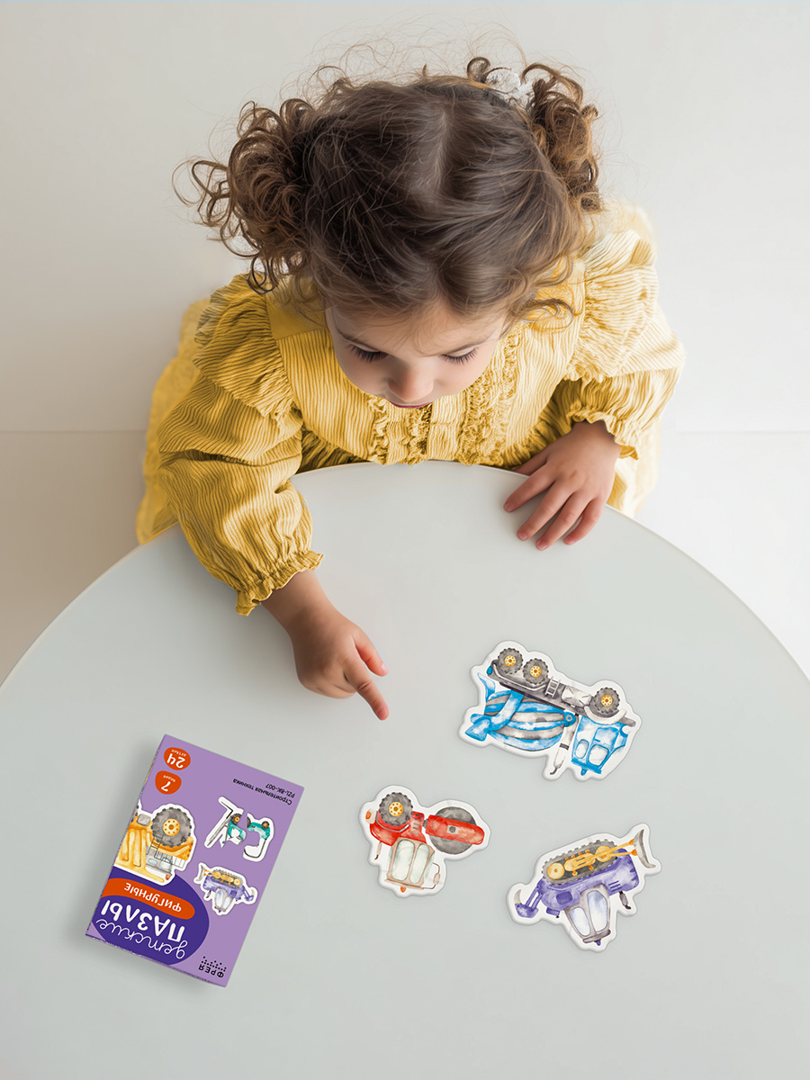 Наши беби-пазлы созданы специально для любознательных малышей: крупные детали удобно держать в ручке, а яркие изображения сразу привлекают внимание. Собирая пазлы, ребенок не просто играет — он развивает мелкую моторику, внимание, логику и речь. Фигурные пазлы, состоящие из нескольких элементов, учат ребенка собирать цельный образ из частей и развивают пространственное мышление. Набор содержит 7 фигурок, состоящих из 2–5 частей. Размеры собранных изображений: от 7 до 19 см.