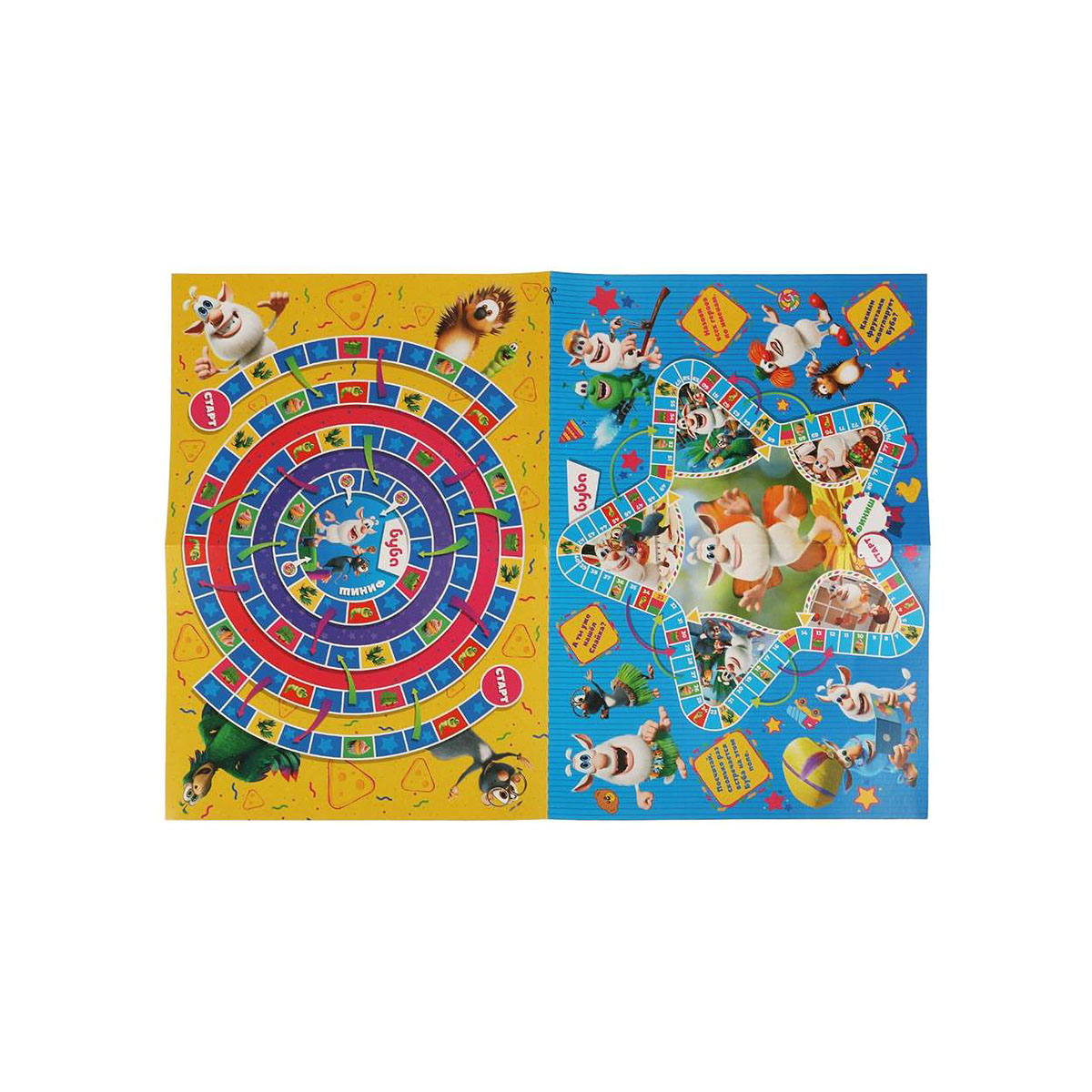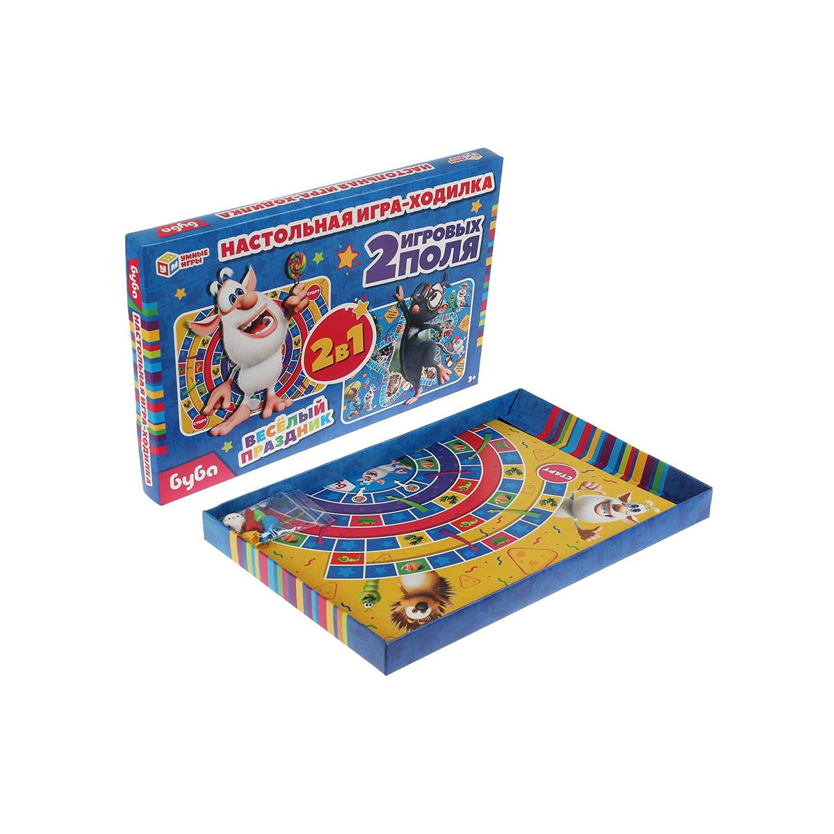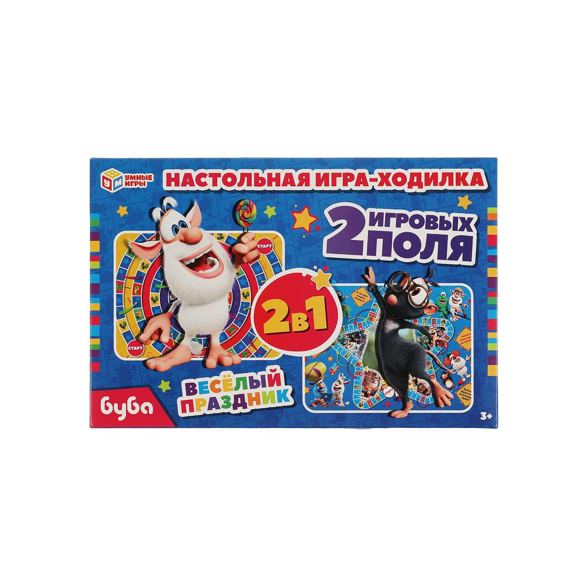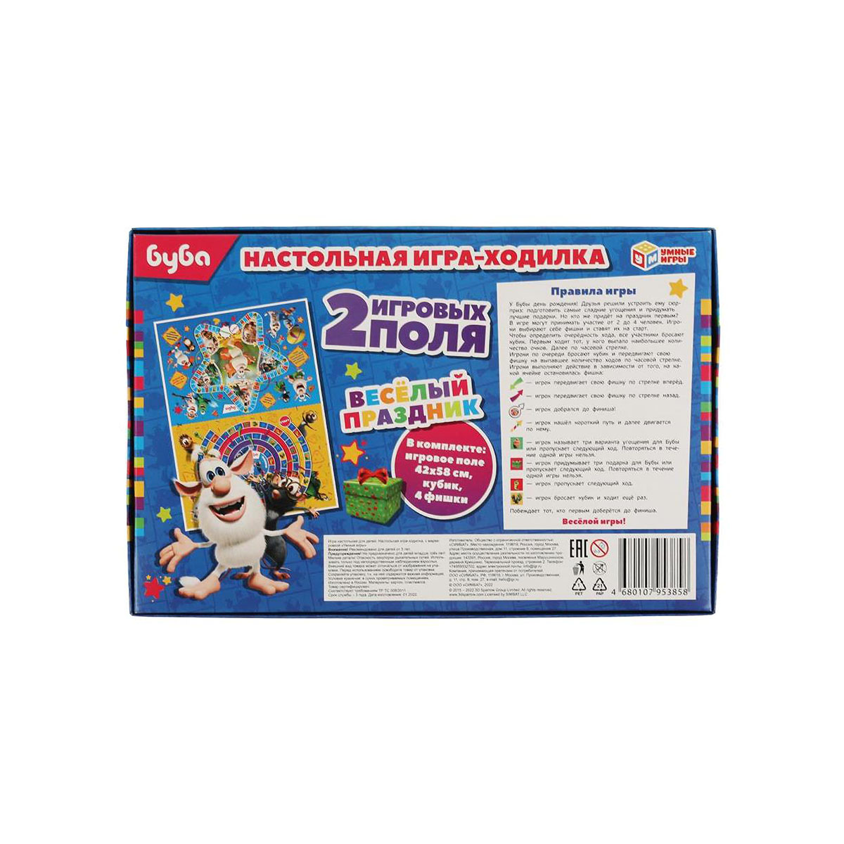 Настольная игра-ходилка 2 в 1 «Буба. Весёлый праздник» ТМ «Умные игры» – это увлекательное времяпровождение для маленького любознайки: - 2 красочных игровых поля в тематике м/ф - 4 фишки и игральный кубик в комплекте - правила игры на обороте упаковки - количество игроков: 2-4