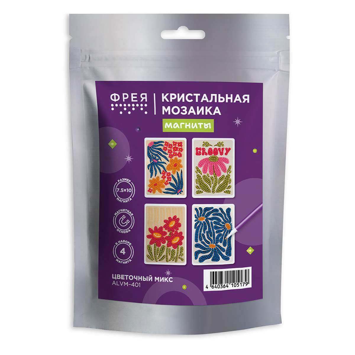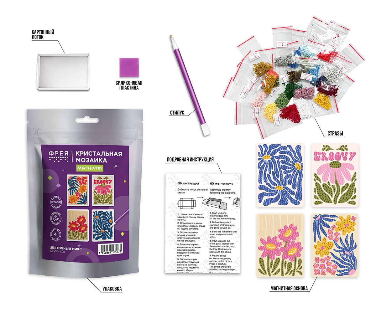 В набор ТМ ФРЕЯ "Кристальная мозаика" входит: - магнитная основа с клеевым слоем и защитной плёнкой: 4 шт, - стилус и восковая подушечка, - круглые стразы: 5 цветов, с запасом более 20%, - картонный лоток, - инструкция.