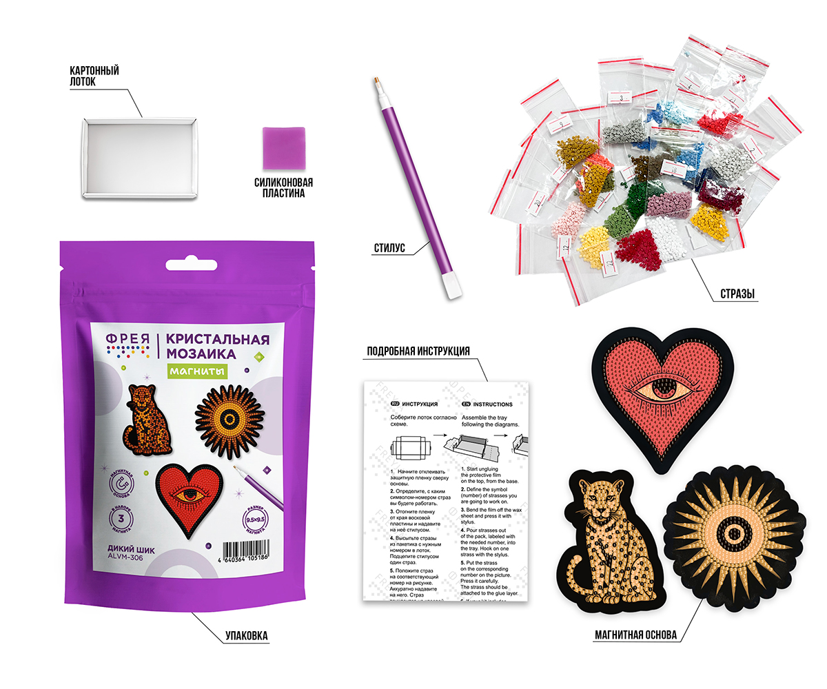 В набор ТМ ФРЕЯ "Кристальная мозаика" входит: - магнитная основа с клеевым слоем и защитной плёнкой: 3 шт, - стилус и восковая подушечка, - круглые стразы:4 цвета, с запасом более 20%, - картонный лоток, - инструкция.