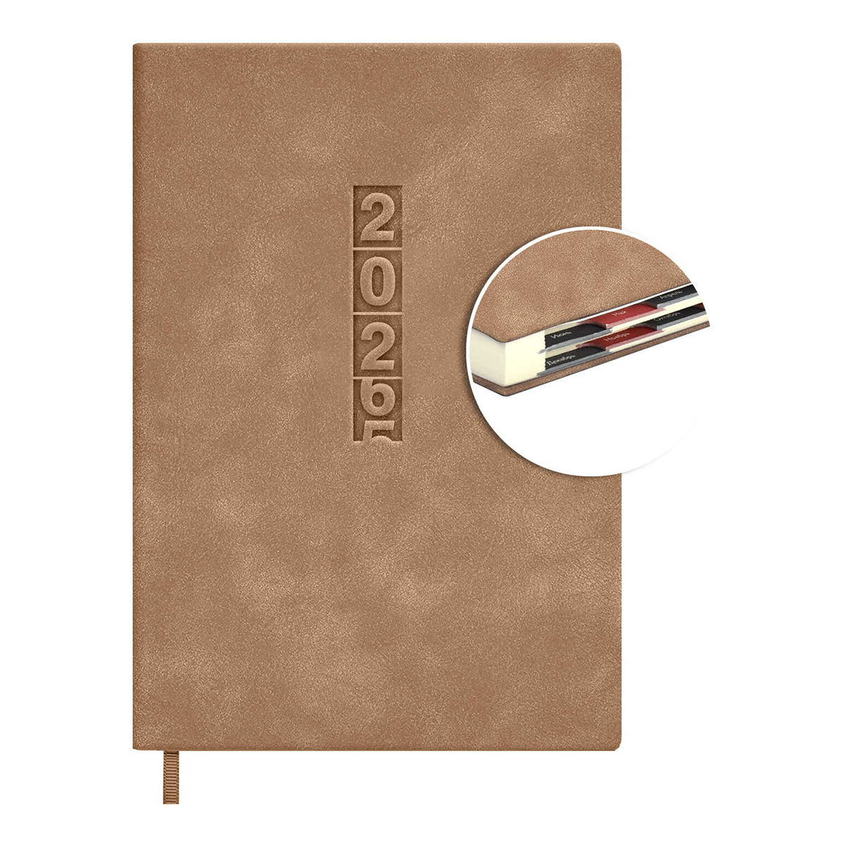 Ежедневник датированный 2026 ESCALADA, формат А5 [146x211 мм], 176 л. Обложка: мягкий переплёт, запаянный край, блинтовое тиснение, обстрочка по периметру - нет, скруглённый корешок, прямые углы обложки. Внутренний блок: ниткошвейный, кремовый офсет 70 г/м?, печать в две краски [линия], прямые углы блока, перфорация углов блока - есть, справочный материал - есть. Красочность форзаца: печать пантоном. Закладка: одно ляссе. Каптал: есть. Особенности: вырубка блока по месяцам, в блоке использованы мотивирующие высказывания экстраординарной личности, предпринимателя и миллиардера, титулованного «Провидца века», шоумена и телеведущего, бывшего владельца конкурса красоты «Мисс Вселенная» и дважды президента США – Дональда Трампа. Индивидуальная упаковка: промостикер + ПЭТ-пакет.