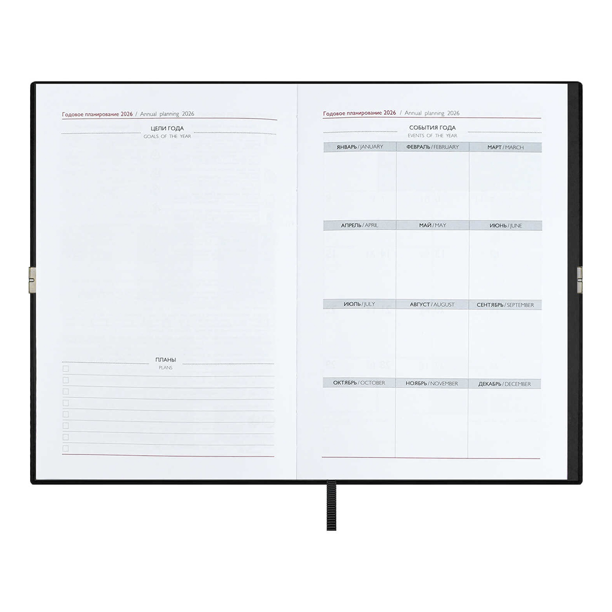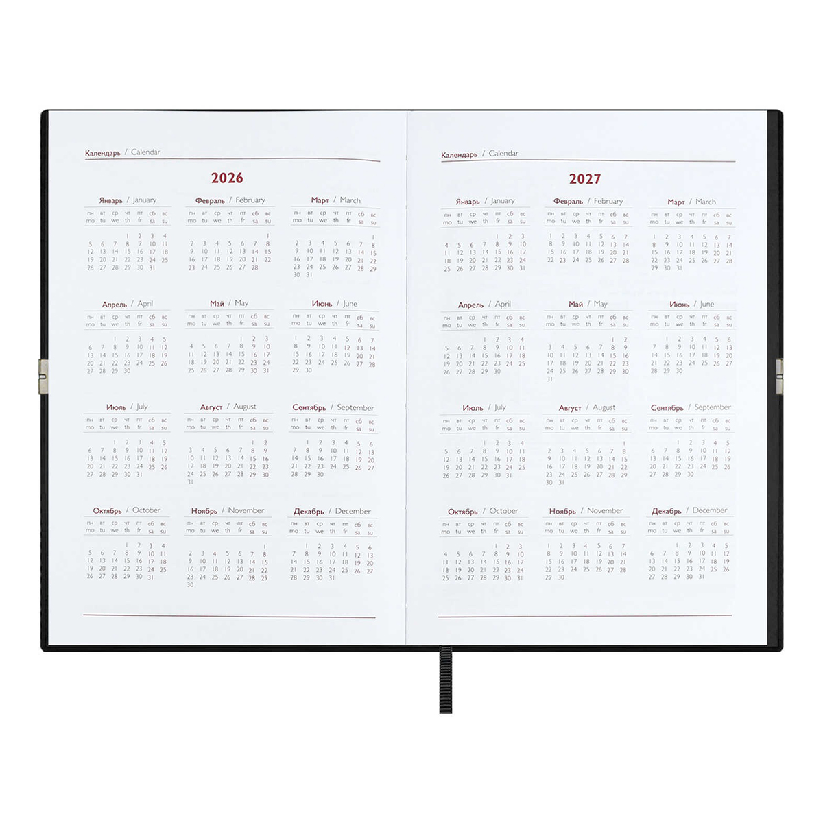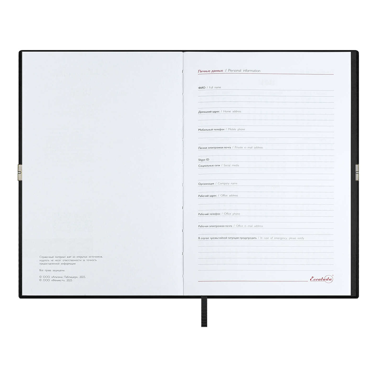 Ежедневник датированный 2026 ESCALADA, формат А5 [146x211 мм], 176 л. Обложка: мягкий переплёт, блинтовое тиснение, обстрочка по периметру - нет, скруглённый корешок, прямые углы обложки. Внутренний блок: ниткошвейный, белый офсет 70 г/м?, печать в две краски [линия], прямые углы блока, перфорация углов блока - нет, справочный материал - есть. Красочность форзаца: печать пантоном. Отделка среза: окрашивание пантоном. Закладка: одно ляссе. Каптал: есть. Особенности: в блоке использованы мотивирующие высказывания экстраординарной личности, предпринимателя и миллиардера, титулованного «Провидца века», шоумена и телеведущего, бывшего владельца конкурса красоты «Мисс Вселенная» и дважды президента США – Дональда Трампа, застёжка-резинка. Индивидуальная упаковка: промостикер + ПЭТ-пакет.