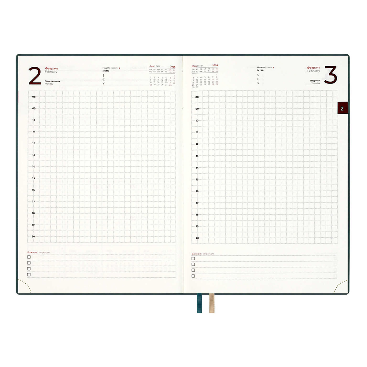 Ежедневник датированный 2026 ESCALADA, формат А5+ [175x245 мм], 176 л. Обложка: запаянный край, интегральный переплёт, тиснение фольгой, обстрочка по периметру - есть, скруглённый корешок, прямые углы обложки. Внутренний блок: ниткошвейный, кремовый офсет 80 г/м?, печать в две краски [клетка], прямые углы блока, перфорация углов блока - есть, справочный материал - есть. Красочность форзаца: печать пантоном. Закладка: два ляссе. Каптал: есть. Особенности: карман функциональный как часть обложки. Индивидуальная упаковка: ПЭТ-пакет.
