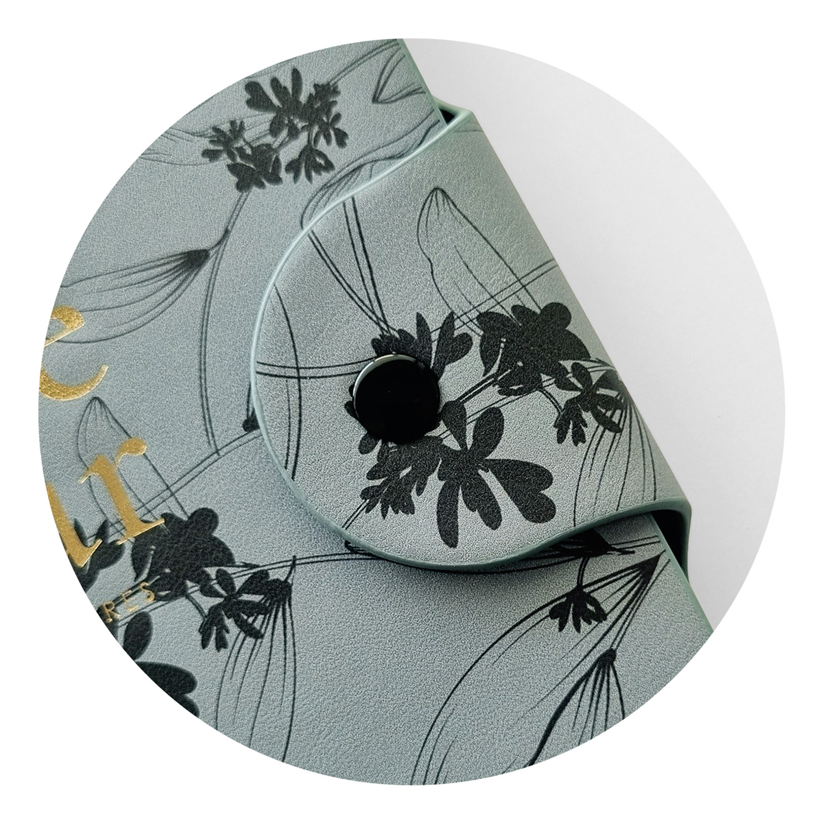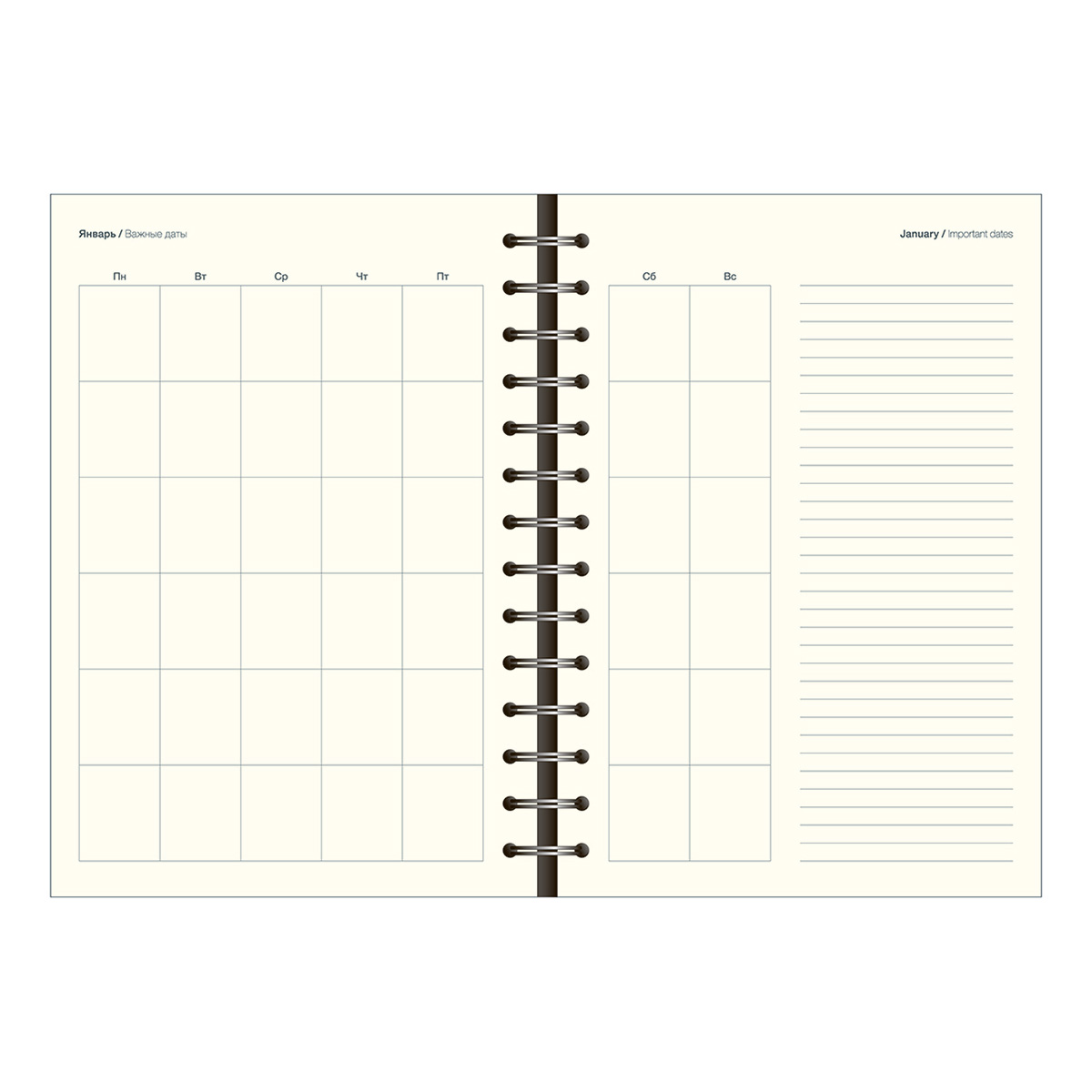 Обложка - мягкая, полускрытая спираль, гладкая искусственная кожа с печатью по материалу, скругленные уголки, цвет - серый. Блок - клетка, 192 стр., бумага: слоновая кость, прямые уголки, 70 г/м2, печать 1+1. Особенности: тиснение золотой фольгой, клапан на кнопке.