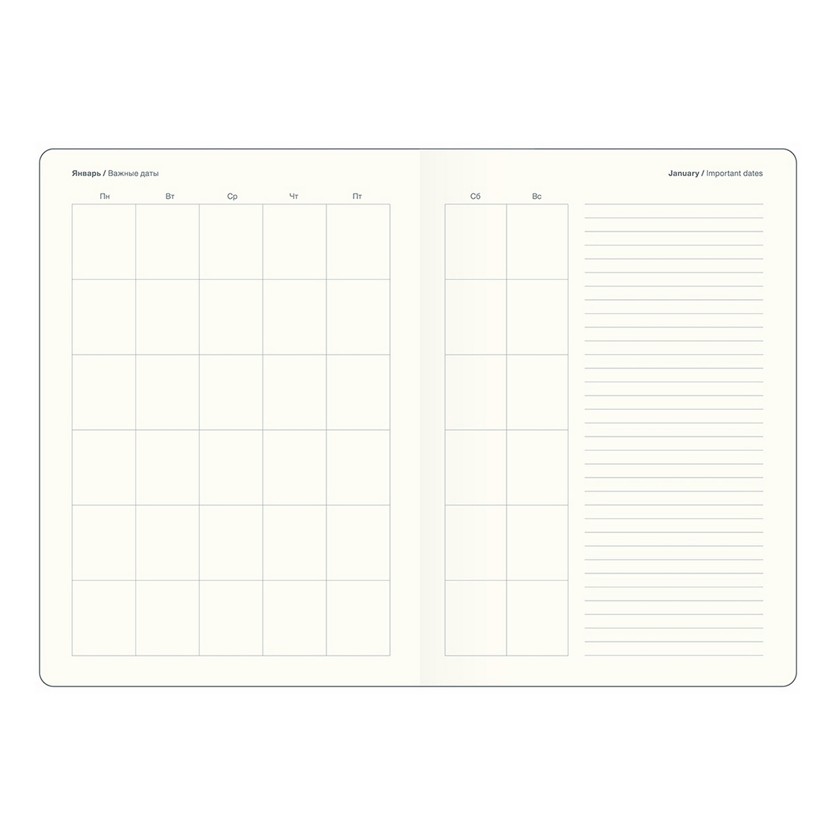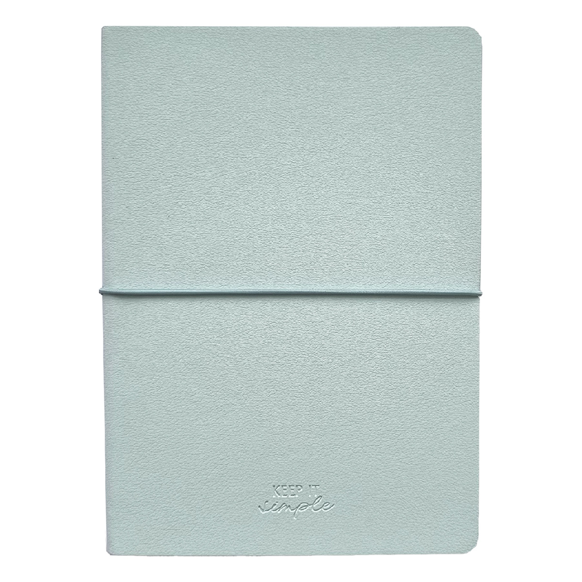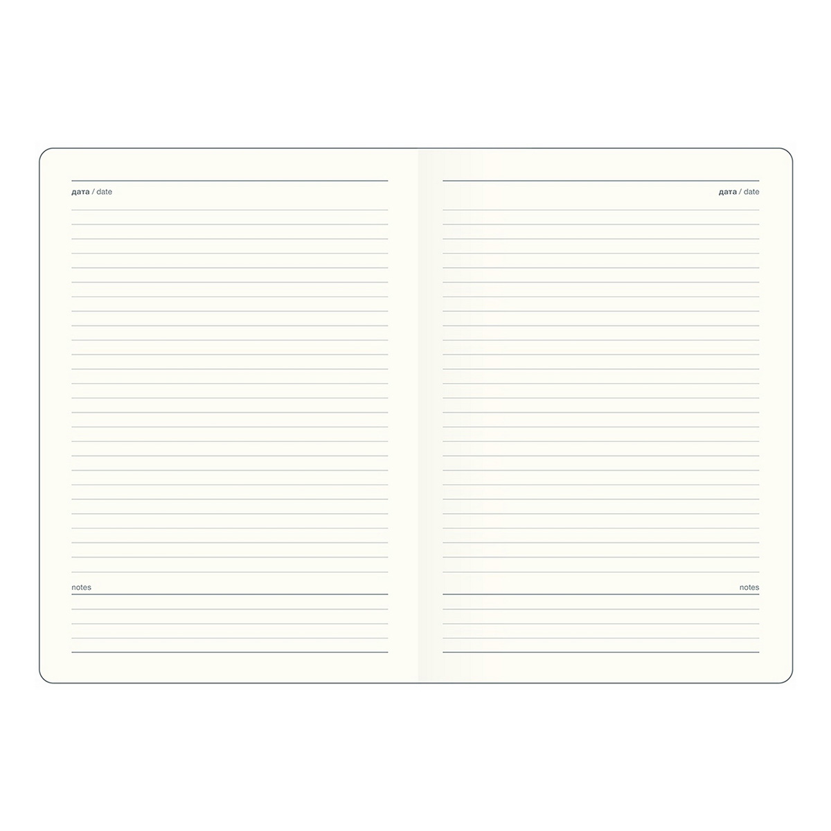 Обложка - мягкая с горизонтальной резинкой, фактурная искусственная кожа с блинтовым тиснением, скругленные уголки, цвет - голубой. Блок - линейка, 320 стр. кармашек, 2 ляссе, бумага: слоновая кость, скругленные уголки, 70 г/м2, печать 1+1. Особенности: резинка, ляссе и прокрас обреза блока - в цвет обложки.