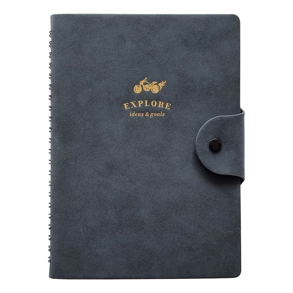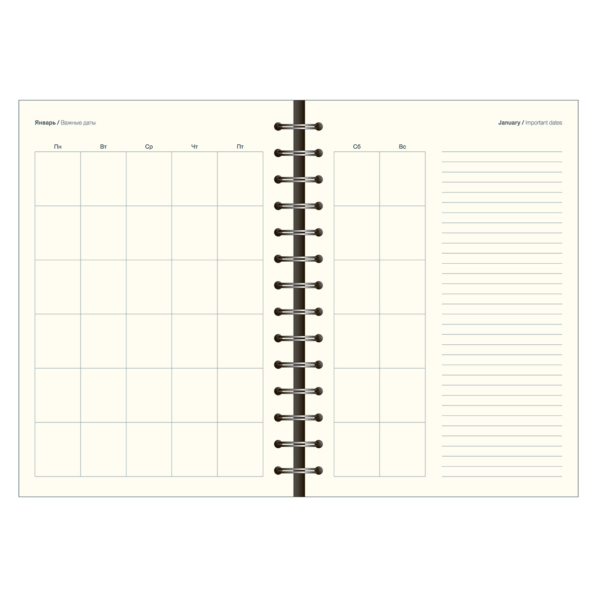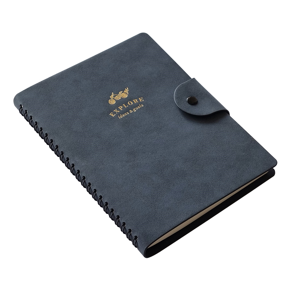 Обложка - мягкая, полускрытая спираль, высококачественная искусственная замша, скругленные уголки, цвет - синий. Блок - клетка, 192 стр., бумага: слоновая кость, прямые уголки, 70 г/м2, печать 1+1. Особенности: тиснение золотой фольгой, клапан на кнопке.