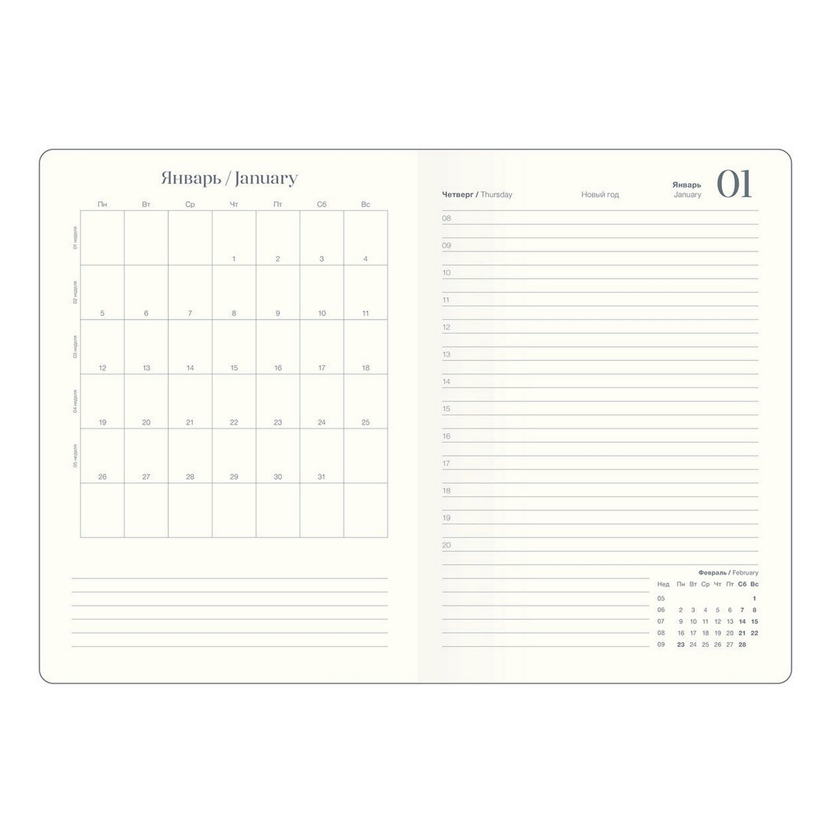 Обложка - мягкая с горизонтальной резинкой, фактурная искусственная кожа с блинтовым тиснением, скругленные уголки, цвет - желтый. Блок - датированный, 352 стр., кармашек, 2 ляссе, бумага: слоновая кость, скругленные уголки, 70 г/м2, печать 1+1. Особенности: резинка, ляссе и прокрас обреза блока - в цвет обложки.