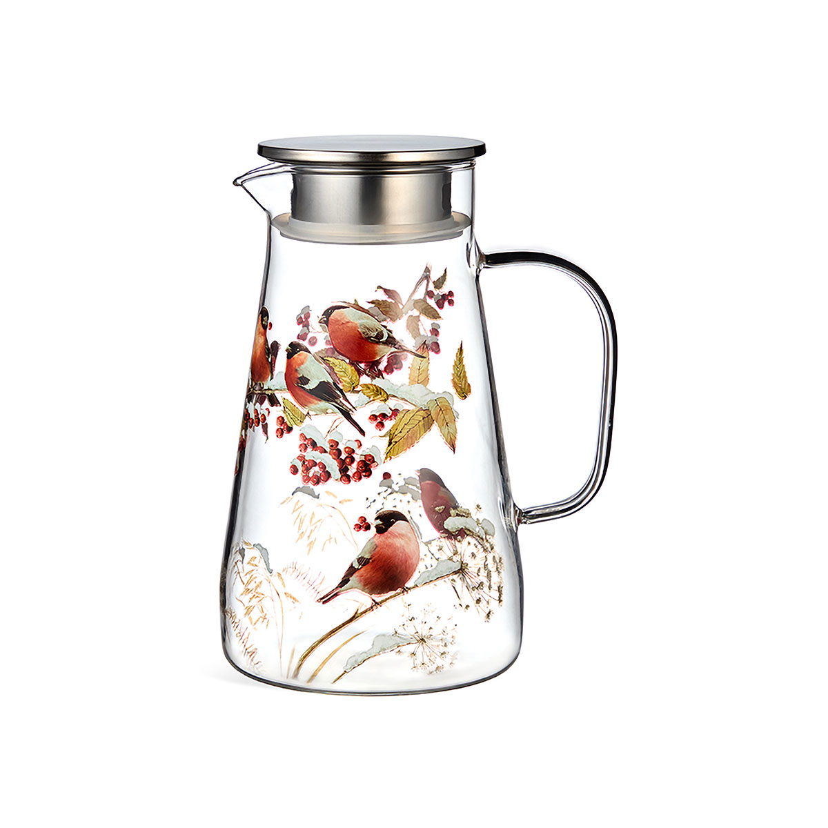 ТМ "Agness" представляет кувшин из коллекции "Снегири". Стеклянный кувшин выполнен из термостойкого жаропрочного стекла, которое выдерживает высокую температуру кипящей воды. Кувшин предназначен для подачи на стол сока, морса и других, не только холодных, но и горячих напитков. Кувшин оснащен удобной ручкой и плотно закрывающейся крышкой. Крышка снабжена силиконовым уплотнителем, благодаря которому она надежно удерживается на корпусе. Носик кувшина выполнен по технологии анти-капля, таким образом, наливая жидкость в стакан, Вы не прольете ни капли. Кувшин прост в использовании, за ним легко ухаживать - достаточно лишь помыть с теплой воде с мыльным раствором. ТМ AGNESS - готовьте с удовольствием!
