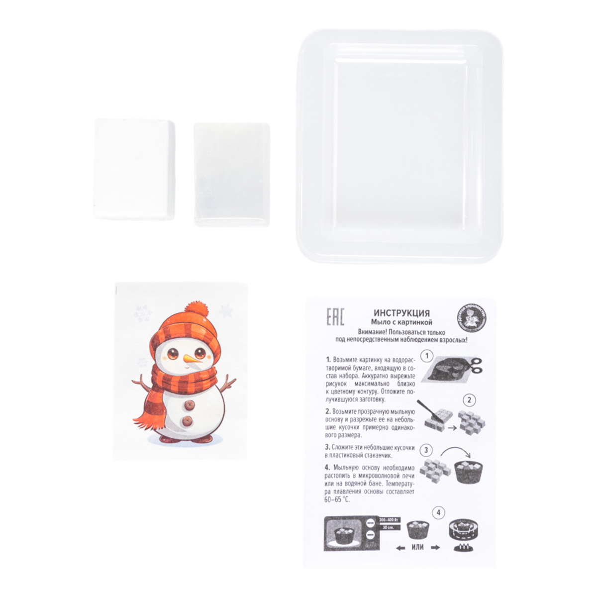 Состав: мыльная основа 2-х видов [прозрачная и белая]; изображение Снеговика на водорастворимой бумаге [5х7 см];