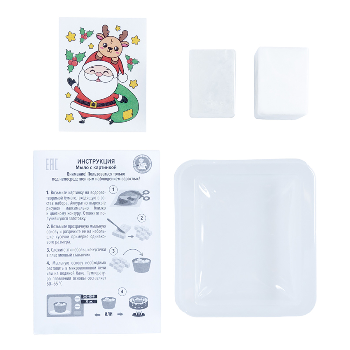 Состав: - мыльная основа 2-х видов [прозрачная и белая]; - картинка на водорастворимой бумаге [6,4 см]; - пластиковая форма - 7,5*6 см - инструкция.