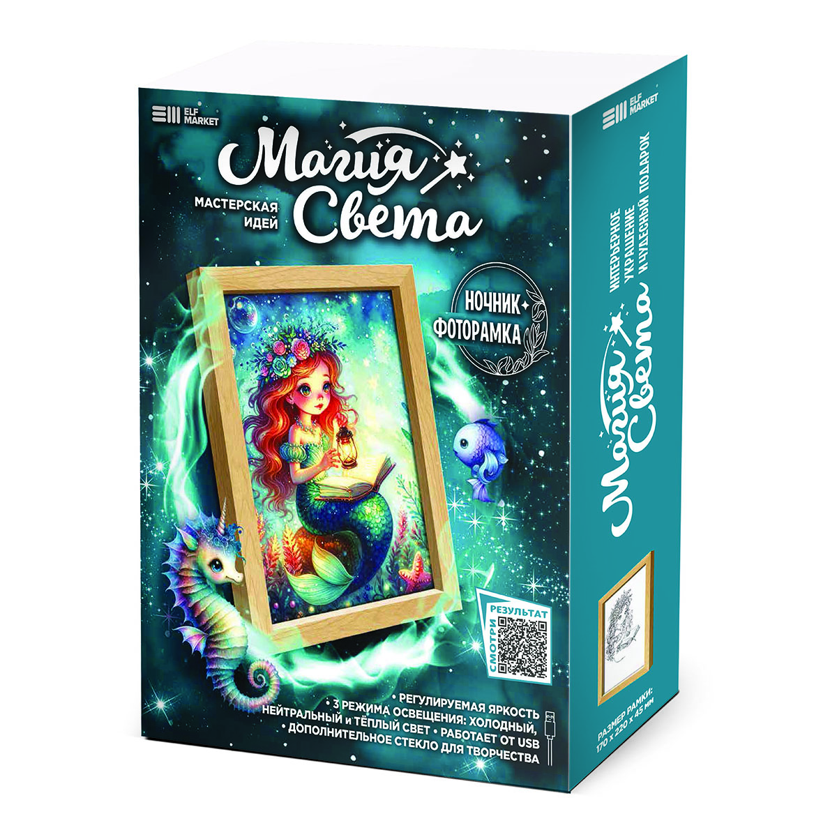 Ночник- фоторамка Магия света "Русалка", ElfMarket, 510101. Ночник с эксклюзивным дизайном и возможностью поставить своего любимого героя или даже свою фотографию! Высокое качество материалов и яркая печать подчеркивают собственно разработанный дизайн и погружают пространство в настоящую Магию света. К набору прилагается дополнительная прозрачная панель для возможности создать свой дизайн.