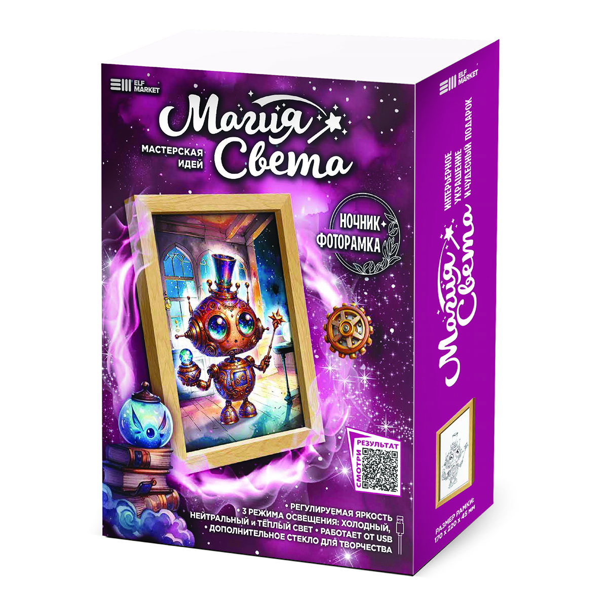 Ночник - фоторамка Магия света "Робот", ElfMarket, 510102. Ночник с эксклюзивным дизайном и возможностью поставить своего любимого героя или даже свою фотографию! Высокое качество материалов и яркая печать подчеркивают собственно разработанный дизайн и погружают пространство в настоящую Магию света. К набору прилагается дополнительная прозрачная панель для возможности создать свой дизайн.