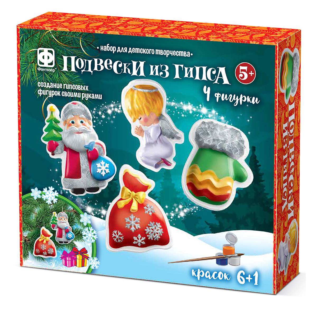 Подвески из гипса Новый год 4 шт Набор №2, Фантазёр, 707720. Этот набор для создания самых необычных елочных украшений. Создайте вместе с ребенком игрушки, которые каждый новый год будут дарить тёплые воспоминания и радость. 4 фигурки. В набор входит: гипс, формы для отливки, бусины, краски, кисть, миска, пластиковый стек, шнур.