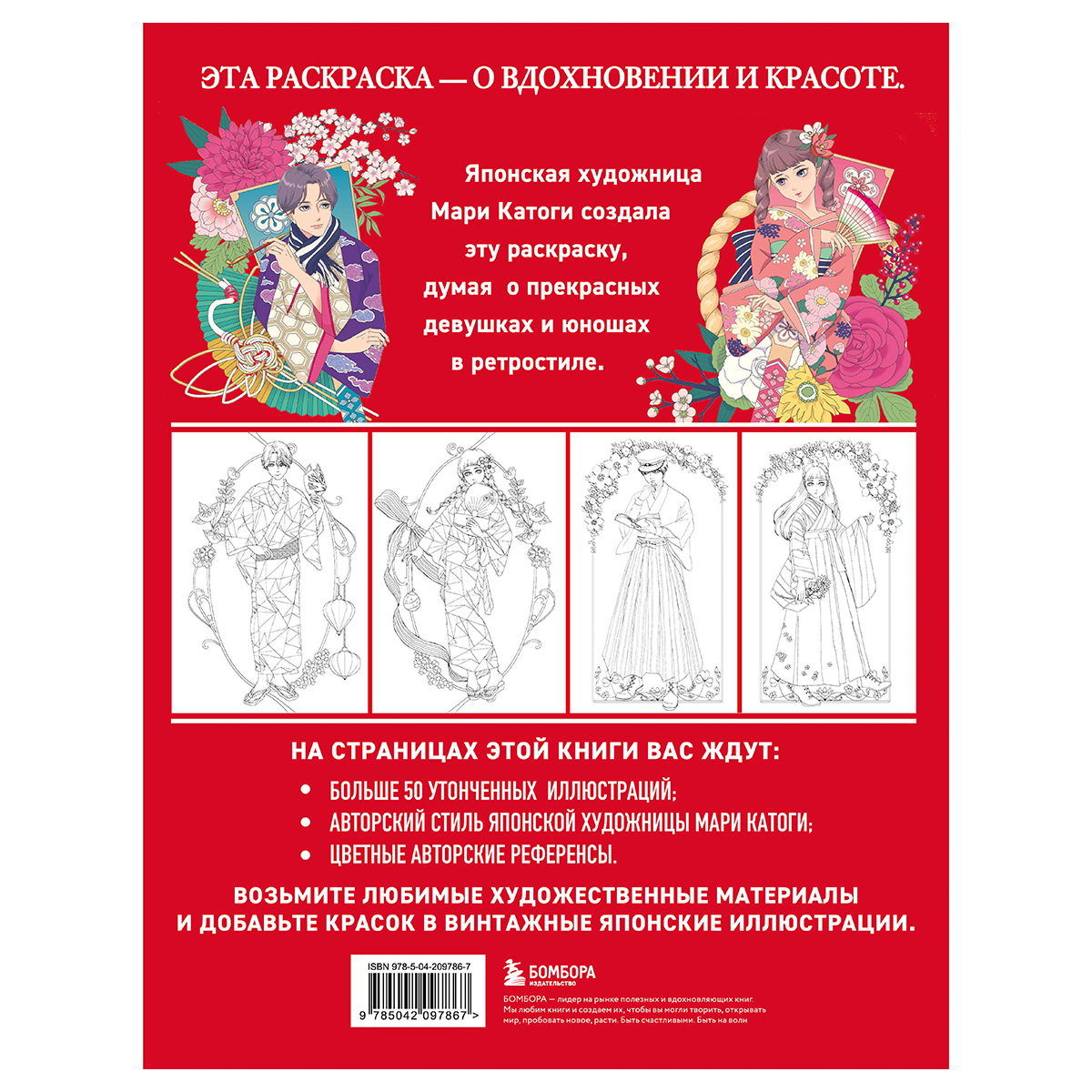Эта раскраска — о вдохновении и красоте. Японская художница Мари Катоги создала эту раскраску, думая о прекрасных девушках и юношах в ретро стиле.