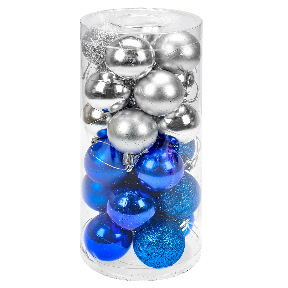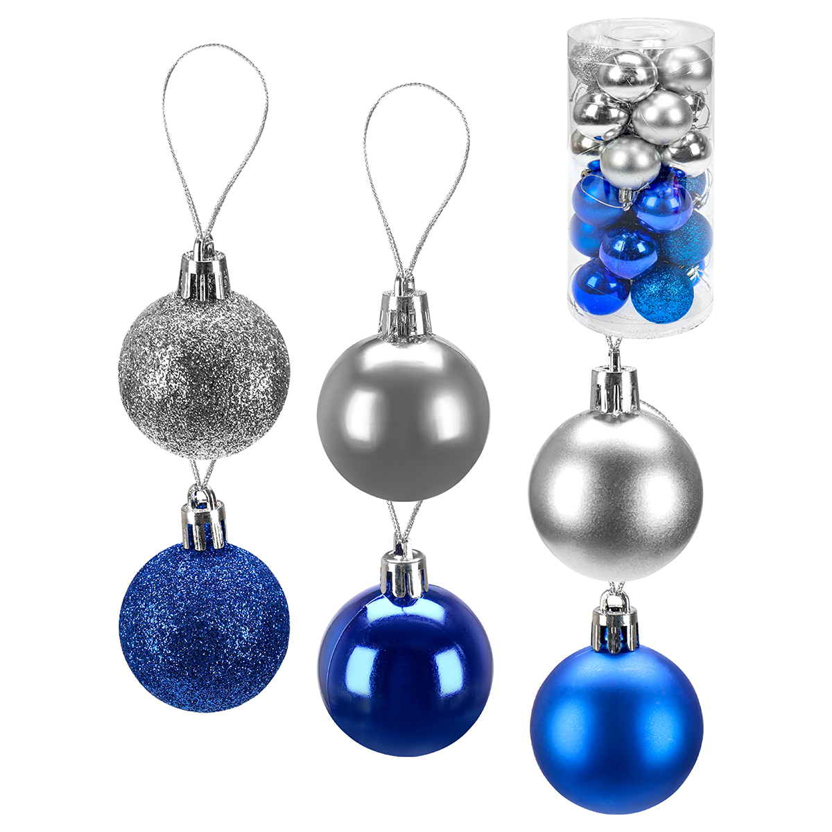 Шар — незаменимое ёлочное украшение, которое поможет создать невероятно уютную атмосферу Нового Года! Набор ёлочных шаров в едином стиле прекрасно подойдёт для декора ёлки или других элементов интерьера. Шары прослужат вам долгие годы, так как сделаны из прочного пластика. Вам не придётся беспокоиться, что дети или животные их разобьют. Размер: 4 см. В наборе 25 шт. Цвет: серебряный,синий. Материал: глитер с узором.