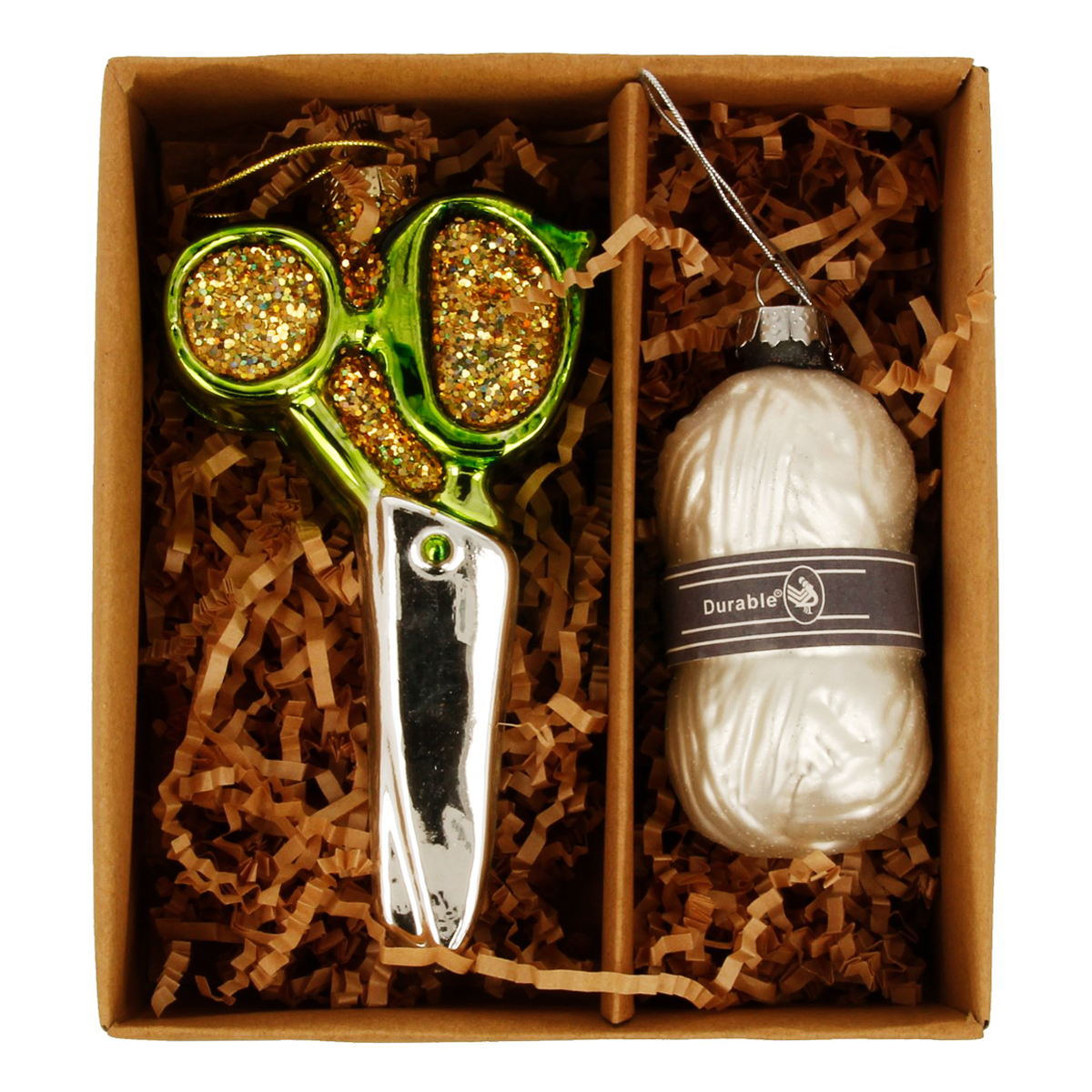Набор подвесных украшений из стекла. Коллекция из формованного стекла - новая переосмысленная версия классических игрушек. Эти подвесы отличаются тонкостью линий, насыщенностью используемых красок, смелой реализацией и современным прочтением привычных вещей. Яркие и акцентные украшения для ели. Разнообразная тематика не оставит никого равнодушным, и Вы сможете подобрать удивительное украшения для себя или в подарок. В набор входит 2 игрушки: ножницы и клубок ниток.