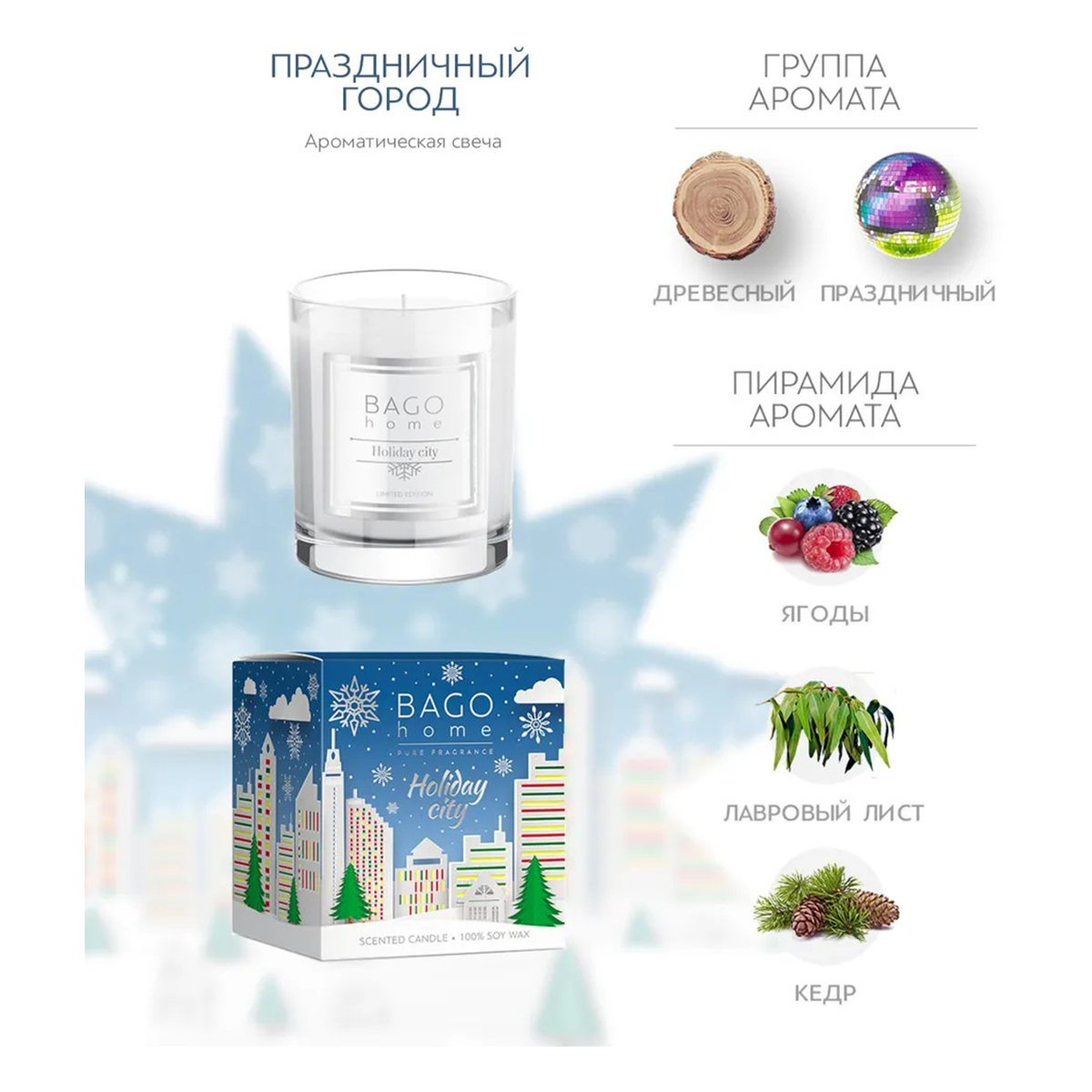 "BAGO home" Ароматическая свеча в стекле 7 х 9 х 8 см 120 г Праздничный город