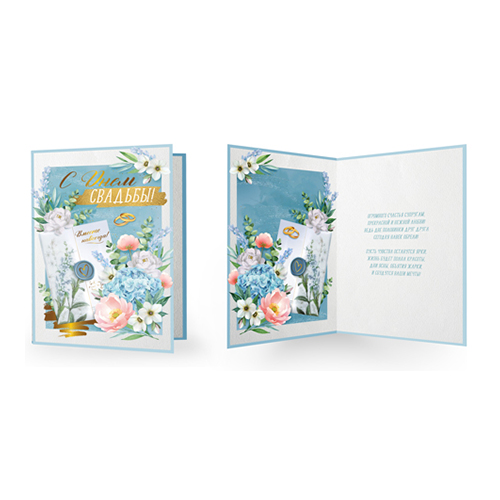 Открытка среднего формата с кратким пожеланием и украшенная отделкой из золотой фольги поможет красиво оформить свадебный подарок молодоженам. Открытка выполнена из плотного картона, поэтому надолго сохранит свой нарядный внешний вид.