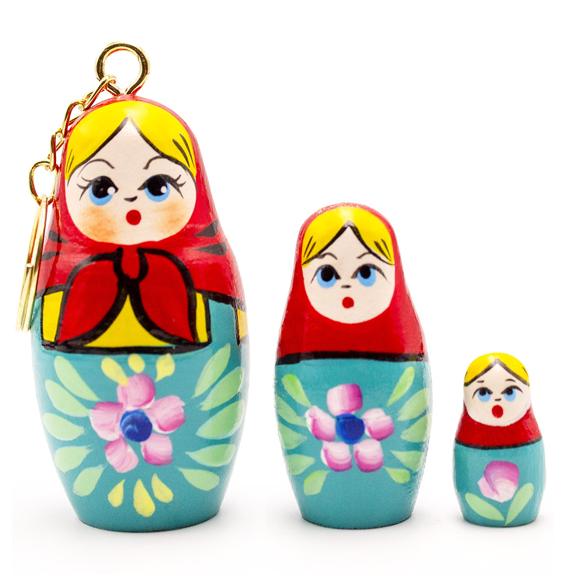 Брелок состоит из 3 мини-матрешек. Безопасные лаки и краска на водной основе, ручная роспись, цепочка и кольцо для ключей