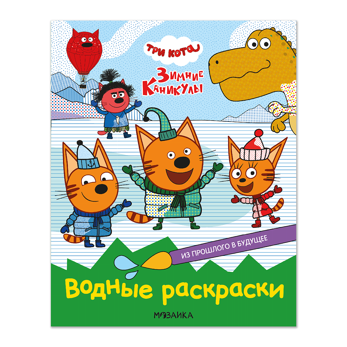 Из прошлого в будущее [Три кота. Водные раскраски], водная раскраска С книжкой «Из прошлого в будущее» из серии «Три кота. Водные раскраски» ребенок весело проведет время вместе с любимыми героями полнометражного мультфильма «Три кота. Зимние каникулы». А еще сможет стать настоящим котоволшебником, раскрасив странички при помощи смоченной в воде кисточки. Каждая иллюстрация очень яркая и находится на отдельном листе. Но не забывайте просушивать страницу, прежде чем ее перевернуть и приступить к следующей картинке. Водные раскраски отлично способствуют развитию творческого мышления и мелкой моторики.