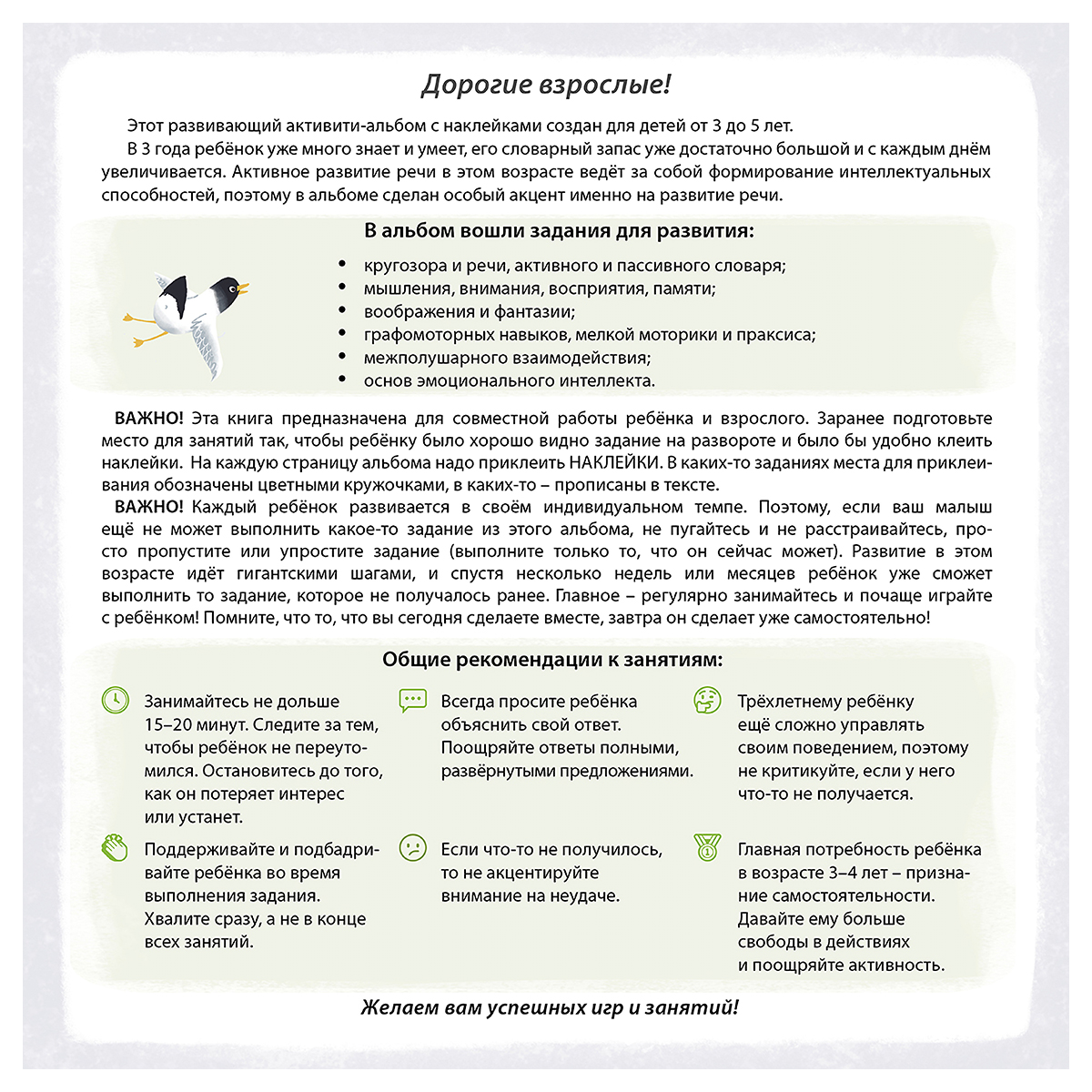 В 3 года ребёнок уже много знает и умеет, его словарный запас уже достаточно большой и с каждым днём увеличивается. Активное развитие речи в этом возрасте ведёт за собой формирование интеллектуальных способностей, поэтому в альбоме сделан особый акцент именно на развитие речи.