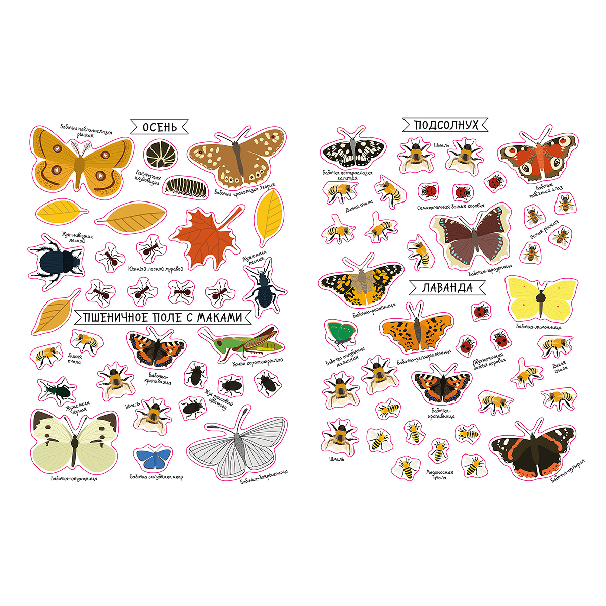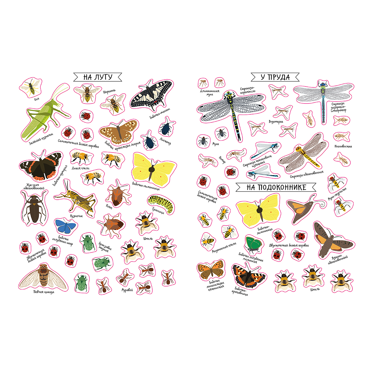 Что найдем внутри: - 13 тематических фонов. - Более 300 наклеек. - Картинки и названия насекомых.