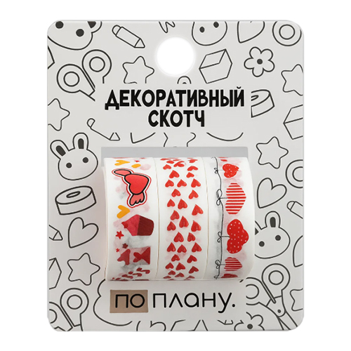 Яркий и разнообразный набор декоративного скотча, идеально подходящий для оформления блокнотов, открыток, ежедневников, подарков и других креативных проектов. Каждый комплект включает по 3 разноцветных лент с уникальными принтами: от геометрических узоров до милых рисунков с животными и сердечками. Скотч легко отрывается, удобно наносится и надёжно фиксируется на поверхности. Отличный выбор для творчества, скрапбукинга и декора