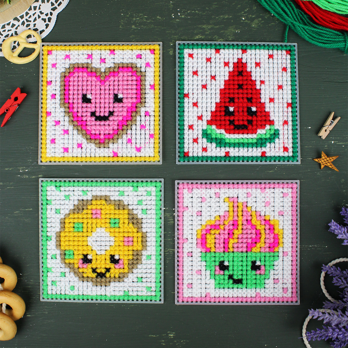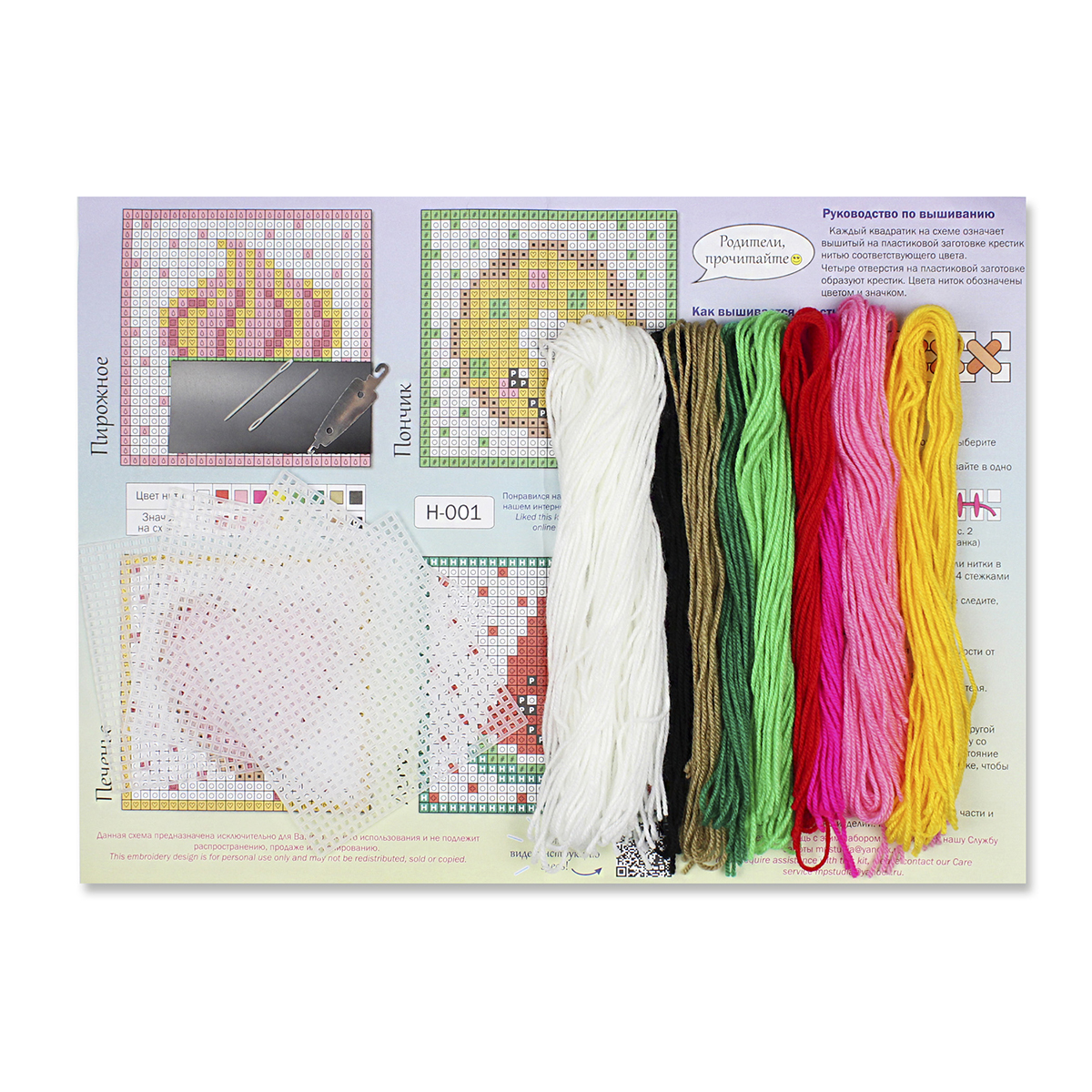 В набор входит: 4 заготовки из пластиковой канвы 11 каунта, пряжа 9 цветов, 2 пластиковые иглы, нитковдеватель, магнитное полотно, бумажная цвето-символьная схема, видеоинструкция и руководство по вышиванию