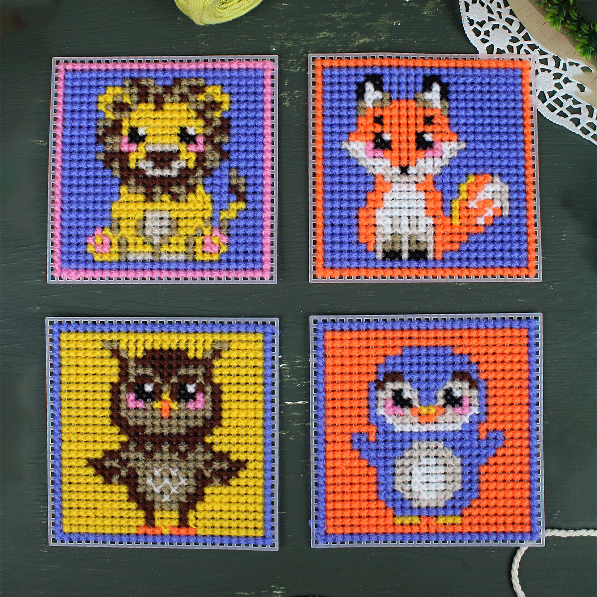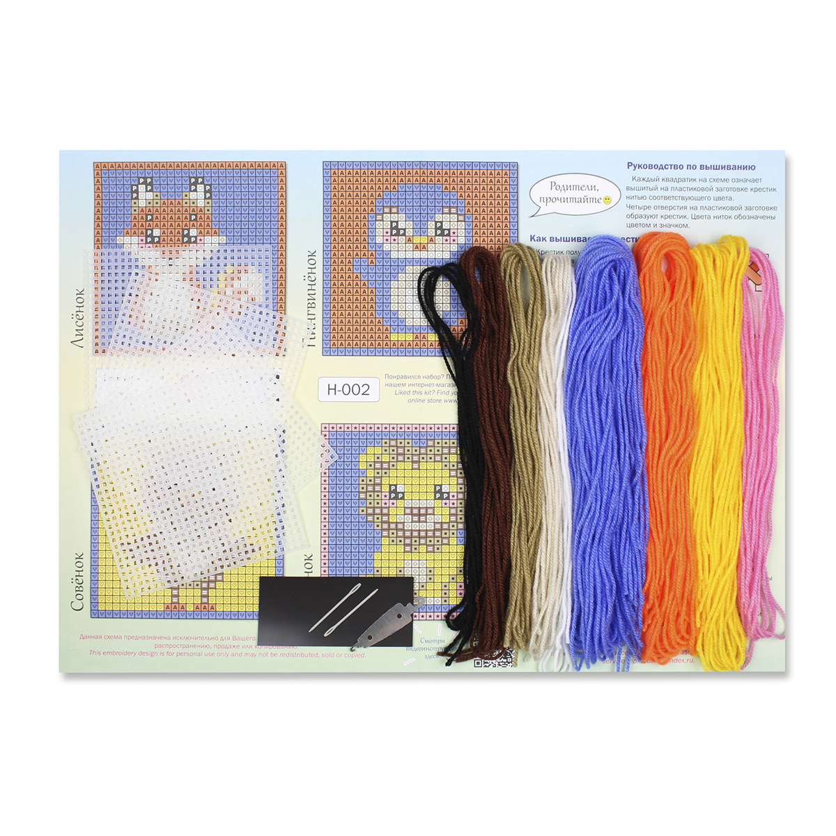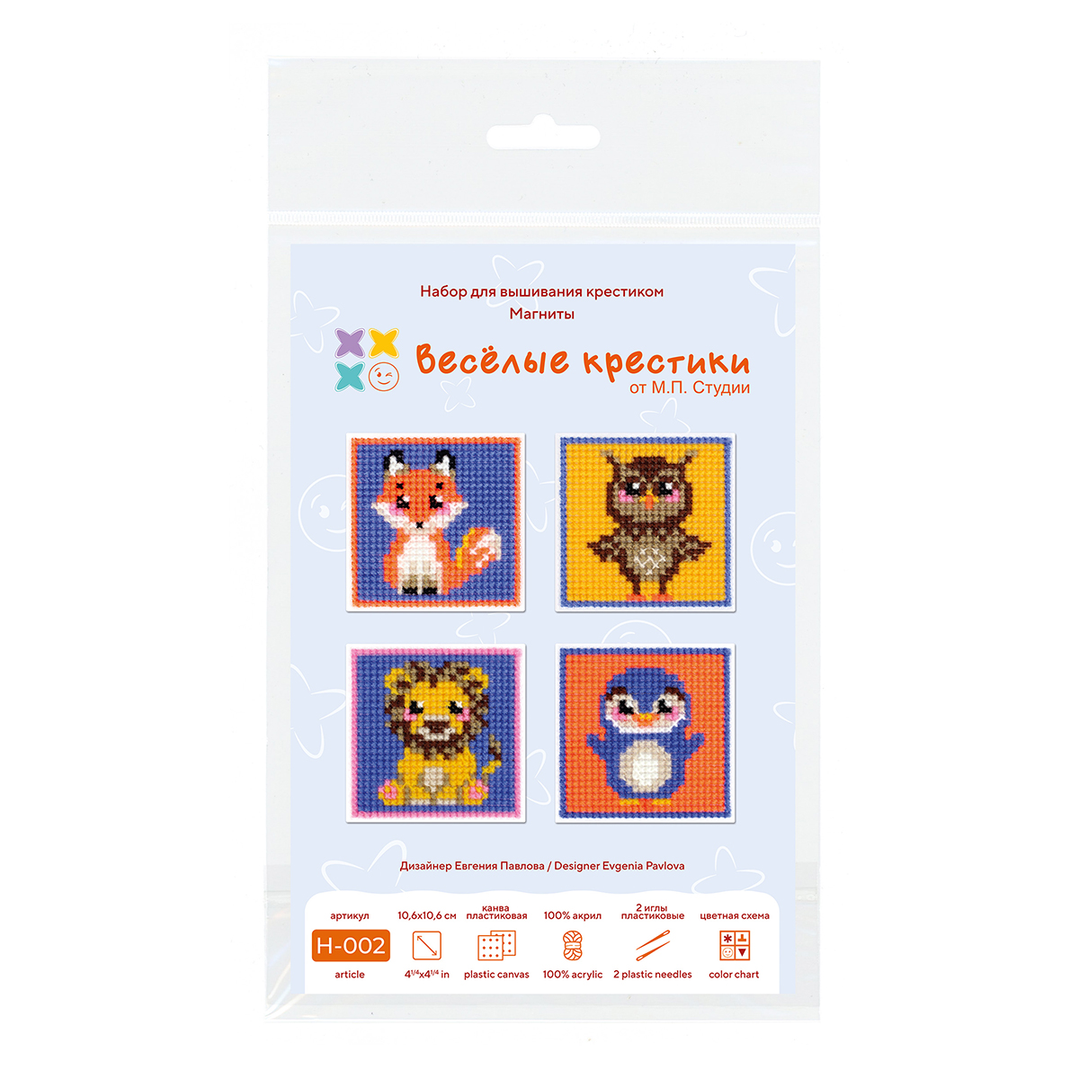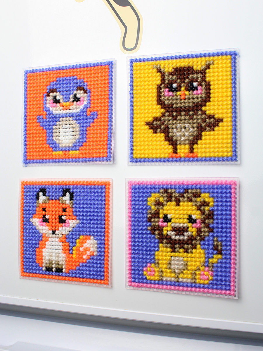 В набор входит: 4 заготовки из пластиковой канвы 11 каунта, пряжа 9 цветов, 2 пластиковые иглы, нитковдеватель, магнитное полотно, бумажная цвето-символьная схема, видеоинструкция и руководство по вышиванию