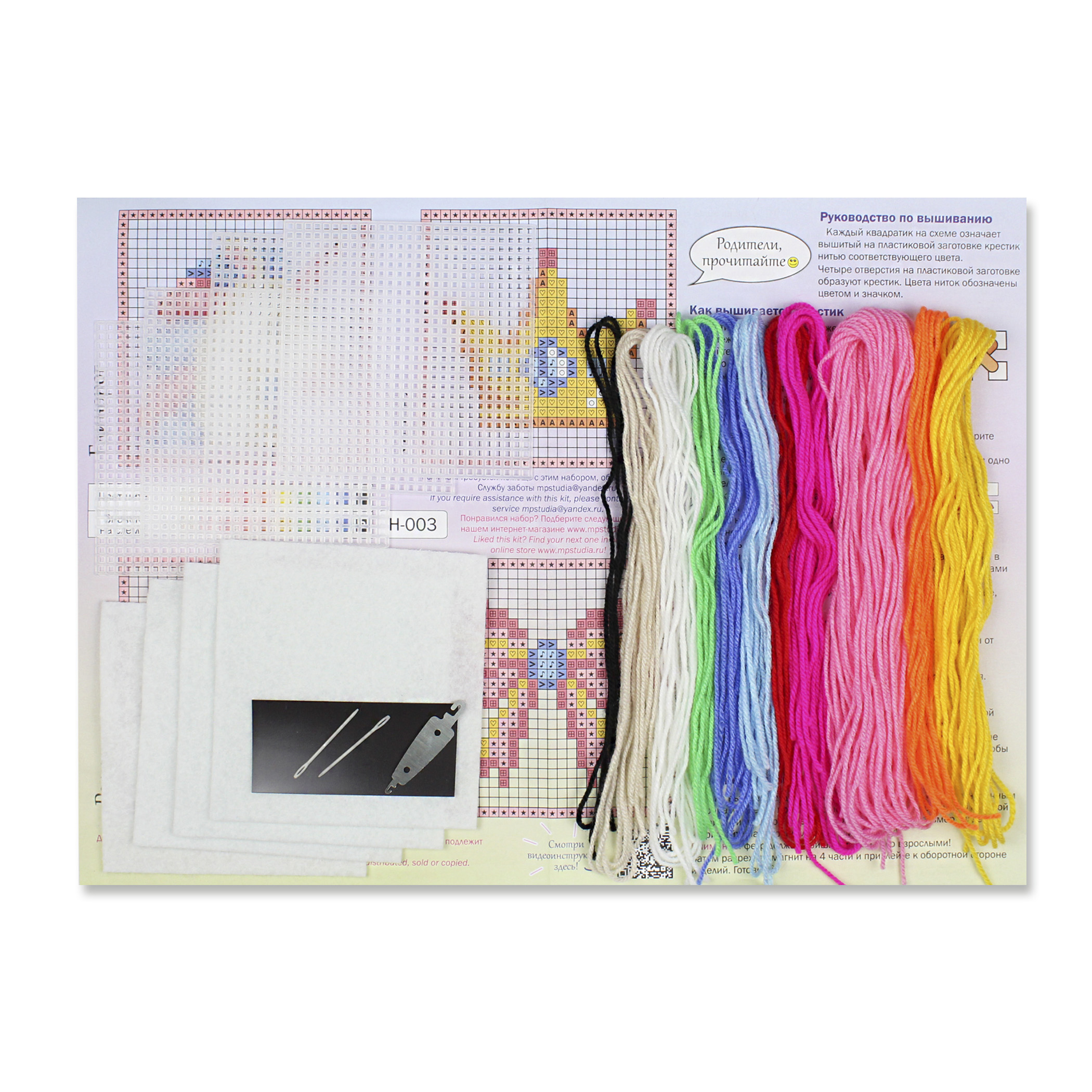 В набор входит: 4 заготовки из пластиковой канвы 11 каунта, пряжа 9 цветов, 2 пластиковые иглы, нитковдеватель, магнитное полотно, бумажная цвето-символьная схема, видеоинструкция и руководство по вышиванию