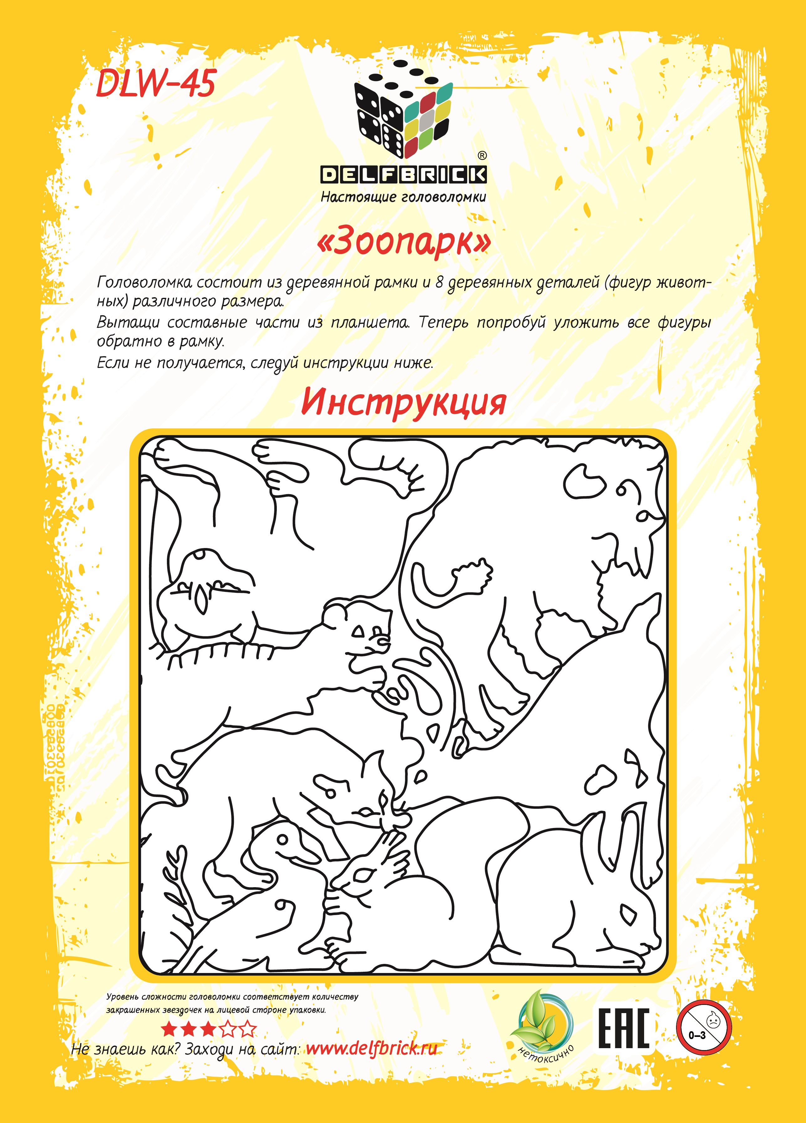 "DELFBRICK" Головоломка "Зоопарк" DLW-45 В комплекте: деревянные детали в форме зверей, закрепляемые на планшете. Упаковка: картонная коробочка с прозрачным "окошком".