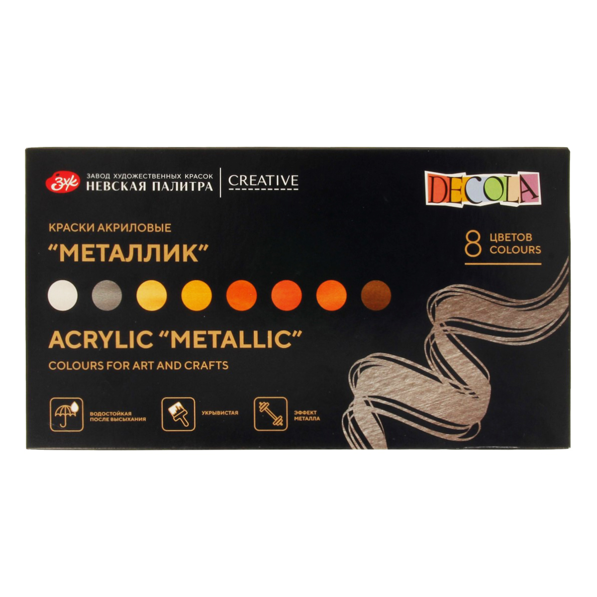 Краски на основе водной акриловой дисперсии. Имитируют цвета металлов, легко наносятся на бумагу, картон, холст, дерево, металл, кожу. При высыхании образуют эластичную несмываемую пленку. Храните краски плотно закрытыми. Кисти и инструменты сразу после работы промойте водой. При попадании на кожу смойте водой.