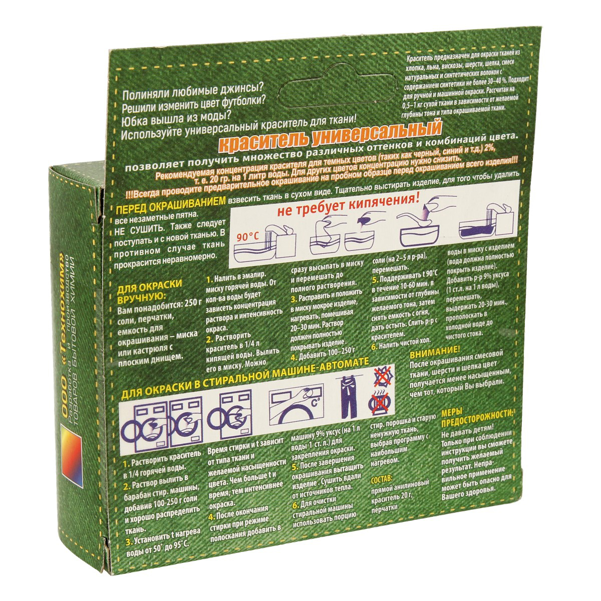 Предназначен для окраски тканей из хлопка, льна, шерсти, шелка, смеси натуральных и синтетических волокон, где синтетики не более 20%. Рассчитан на 1 кг сухой ткани в зависимости от желаемой глубины тона и типа окрашиваемой ткани. Желаемый результат можно получить только при соблюдении инструкции на упаковке.
