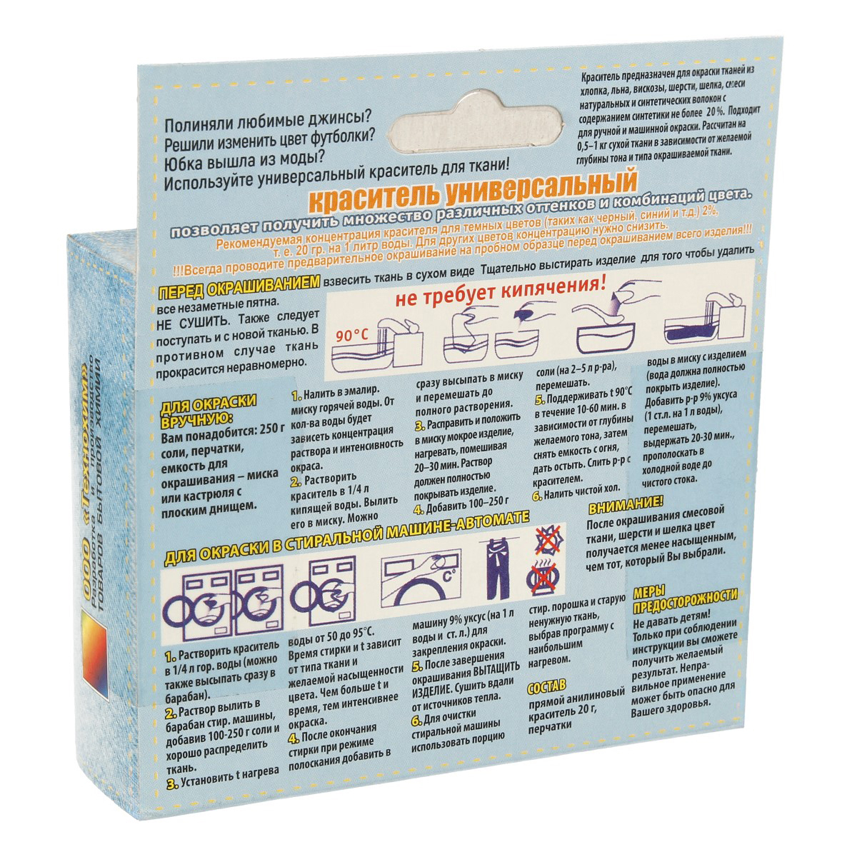 Предназначен для окраски тканей из хлопка, льна, шерсти, шелка, смеси натуральных и синтетических волокон, где синтетики не более 20%. Рассчитан на 1 кг сухой ткани в зависимости от желаемой глубины тона и типа окрашиваемой ткани. Желаемый результат можно получить только при соблюдении инструкции на упаковке.