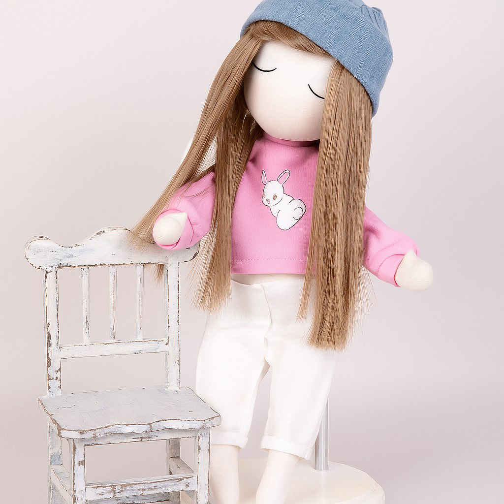 Волосы закреплены с помощью нитки в цвет пряди, сшитой зигзагом. Благодаря своей конструкции волосы не выпадают и крепко держатся на кукле.