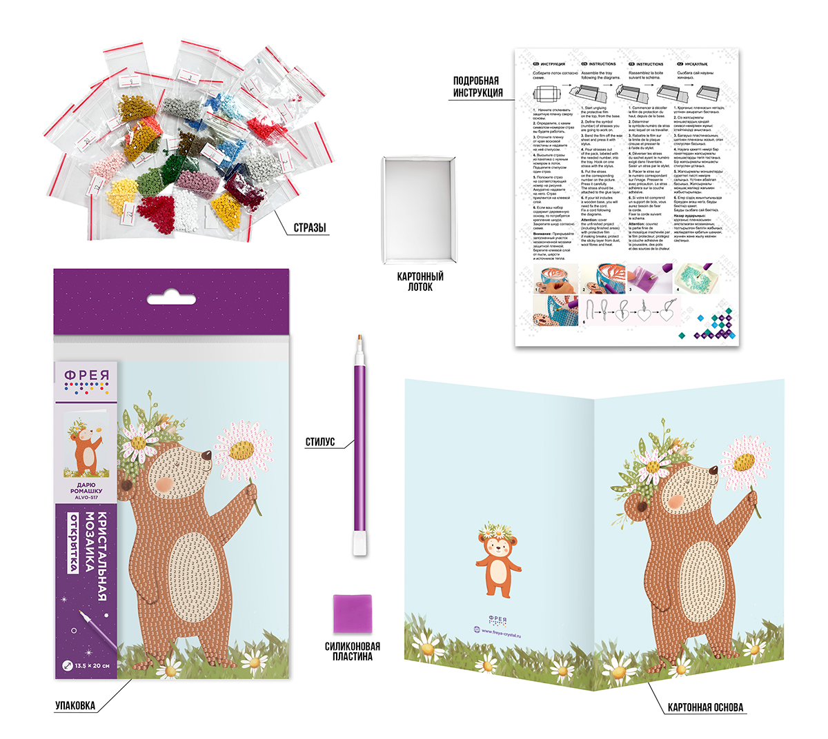 В набор ТМ ФРЕЯ "Кристальная мозаика" входит: - основа открытки с клеевым слоем и защитной плёнкой, - стилус с восковой подушечкой, - круглые стразы с запасом более 30%, - картонный лоток, - инструкция.
